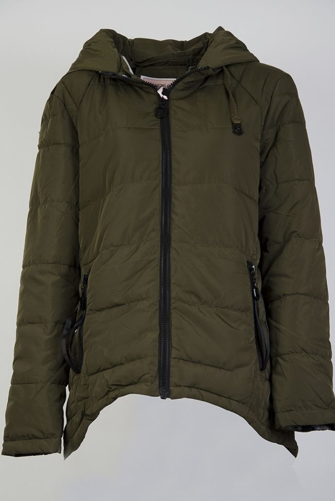 Pikowana, asymetryczna kurtka khaki. Kurtka ma odpinany kaptur.