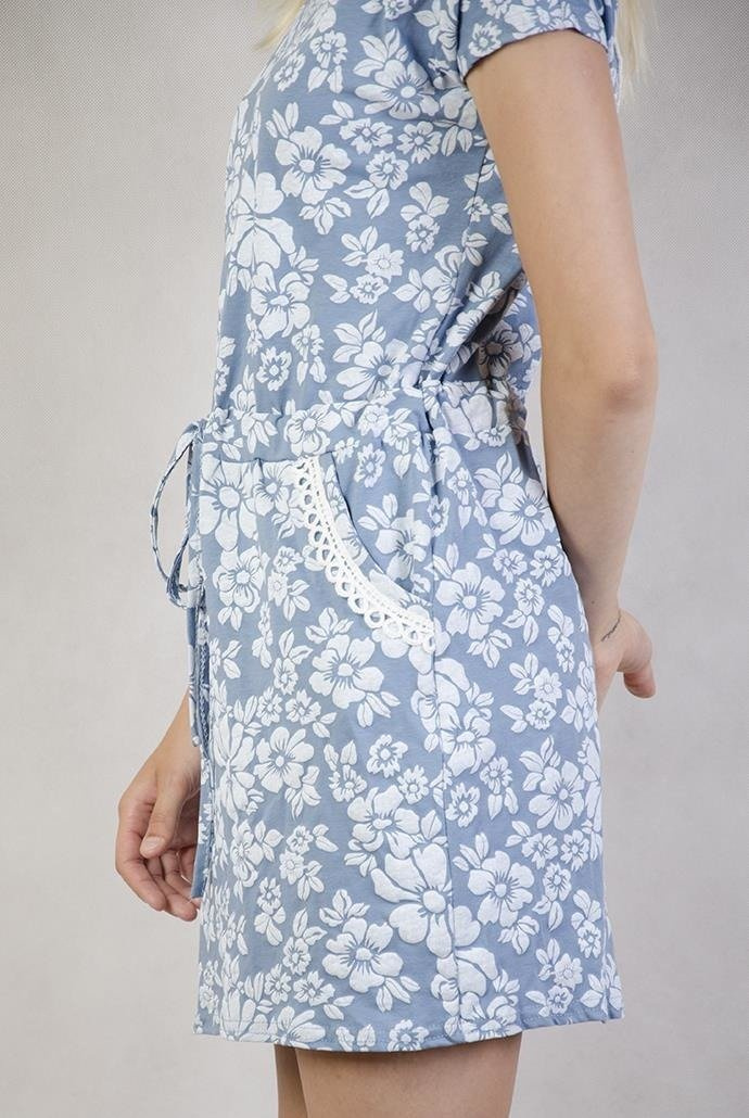 Niebieska sukienka w kwiaty z ozdobnym haftem na plecach