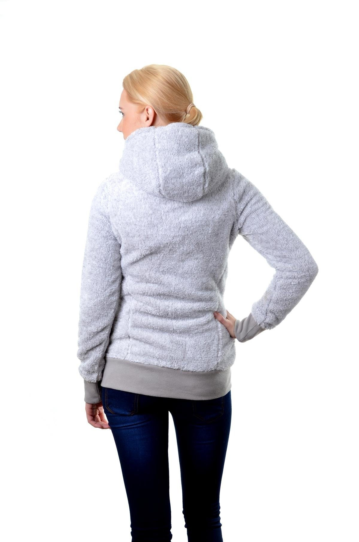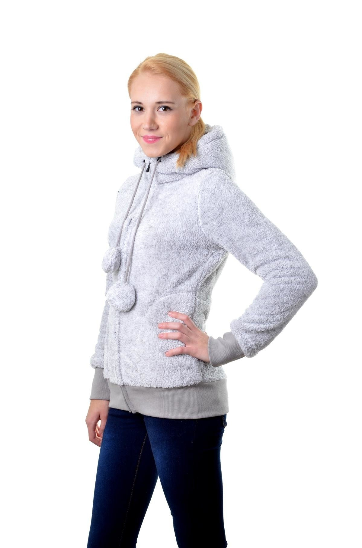 Ciepła i stylowa bluza z kapturem, ściągana sznurkiem wykończonym pomponem, z przodu dwie kieszenie, wykonana z miękkiego pluszowego materiału.