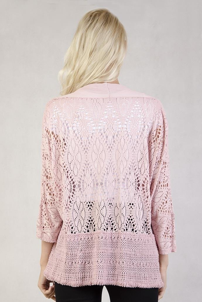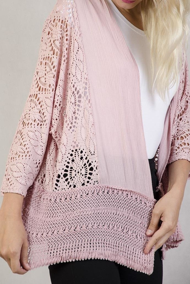 Koronkowa narzutka z szerokim plecionym pasem na dole różowa
