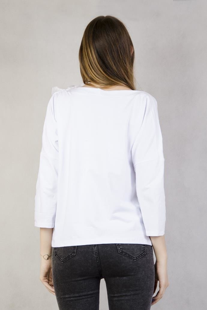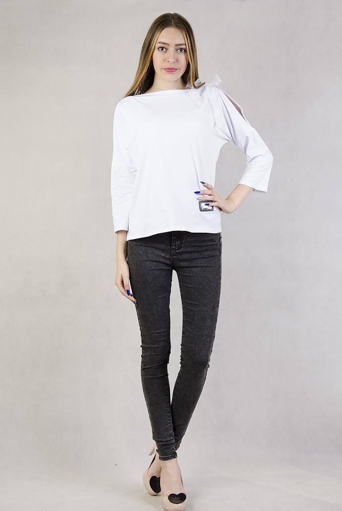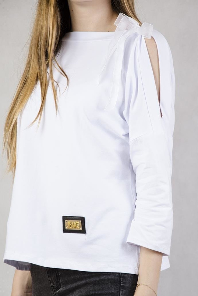 Biała bluzka z wycięciami na ramionach i wstążką