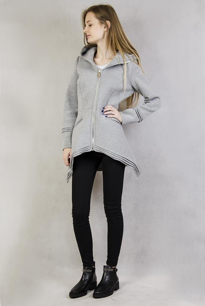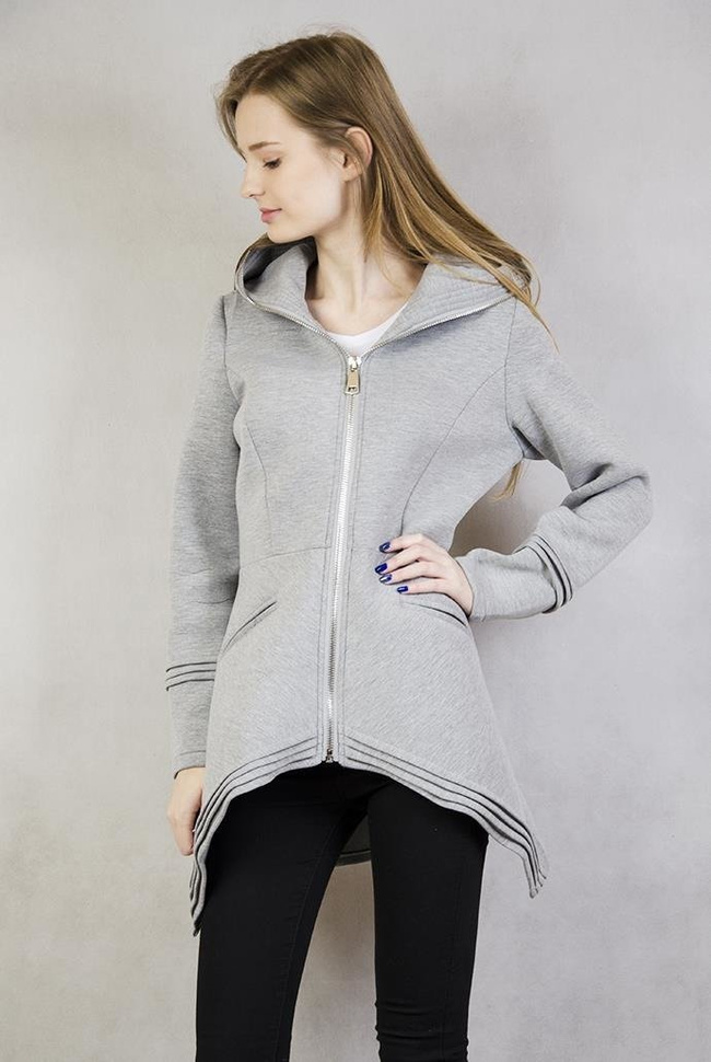 Wygodny, asymetryczny płaszczyk z kapturem.