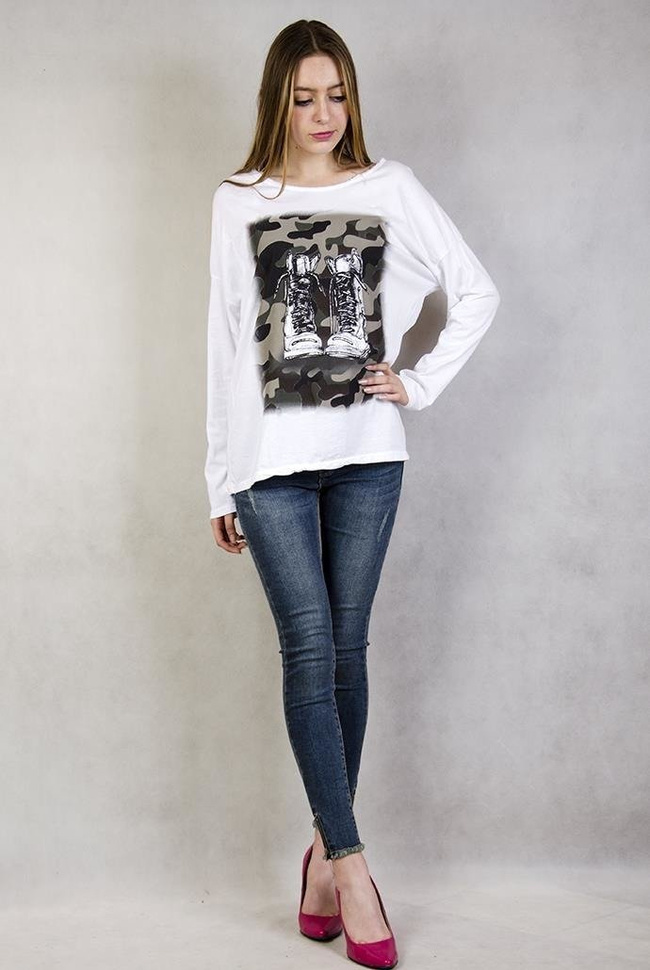 Biała bluzka z wzorem moro i butami w stylu militarnym