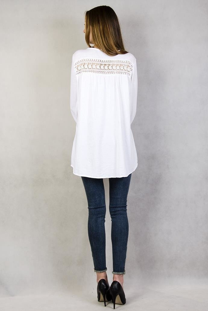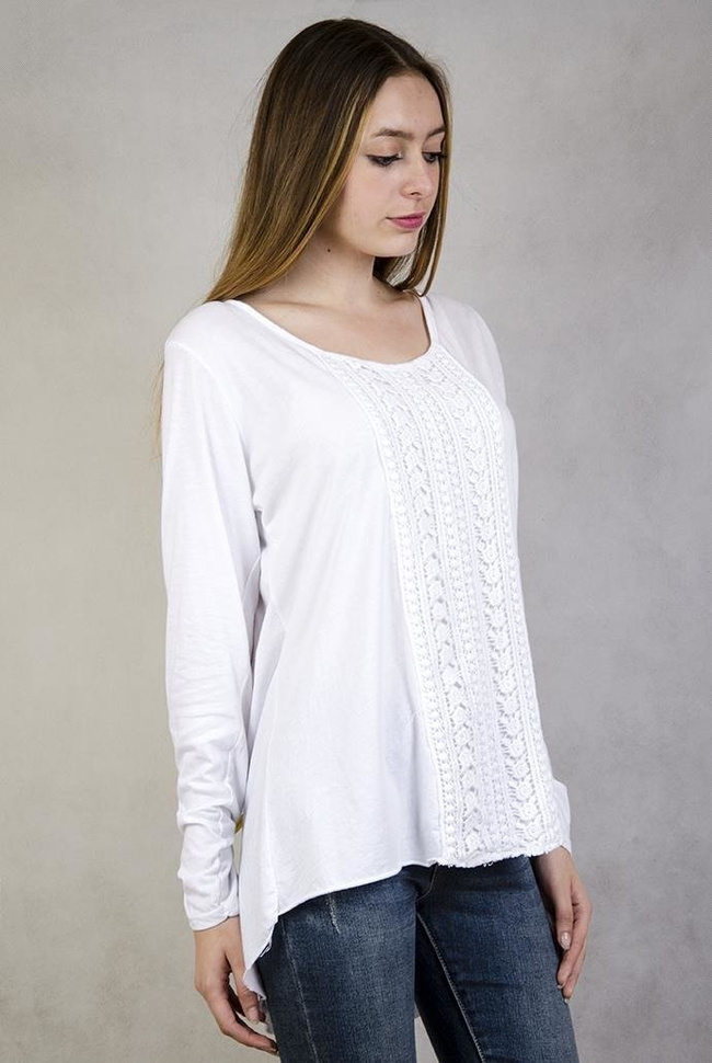 Biała bluzka z ażurowymi zdobieniami i podwijanymi rękawami