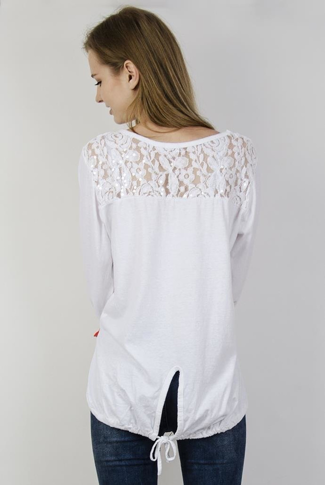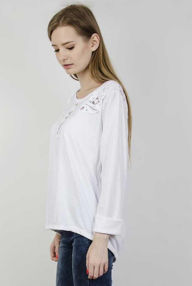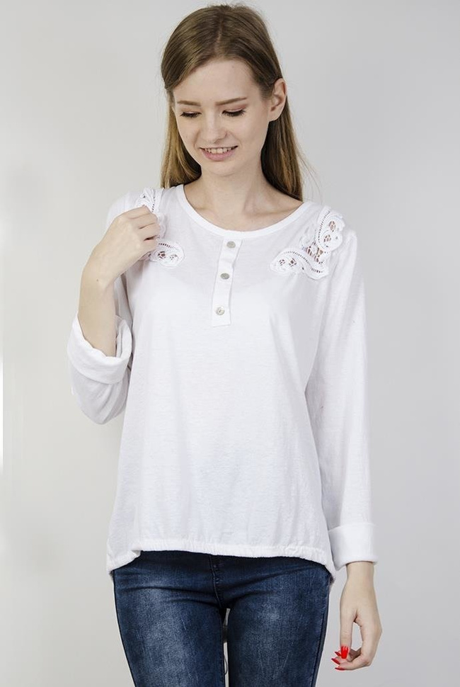 Biała bluzka z guzikami, wzorami przy ramionach i ściągaczem na dole