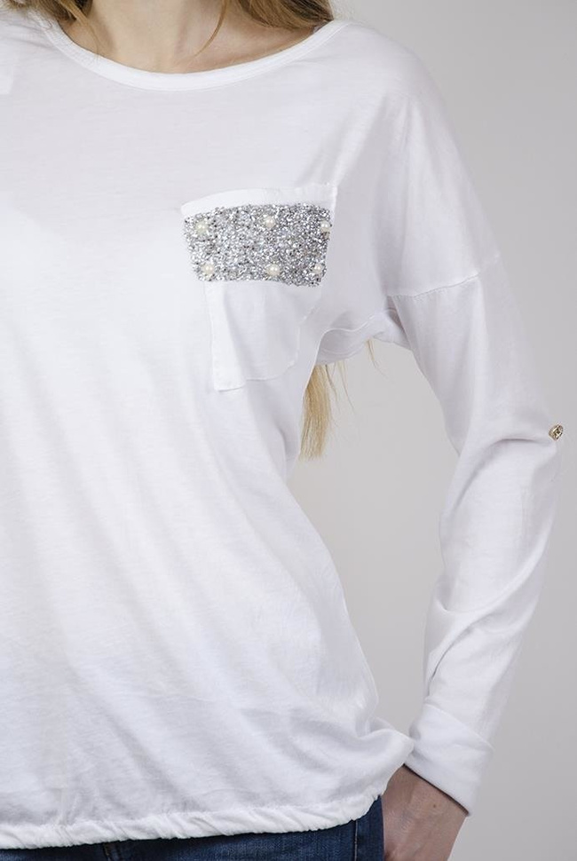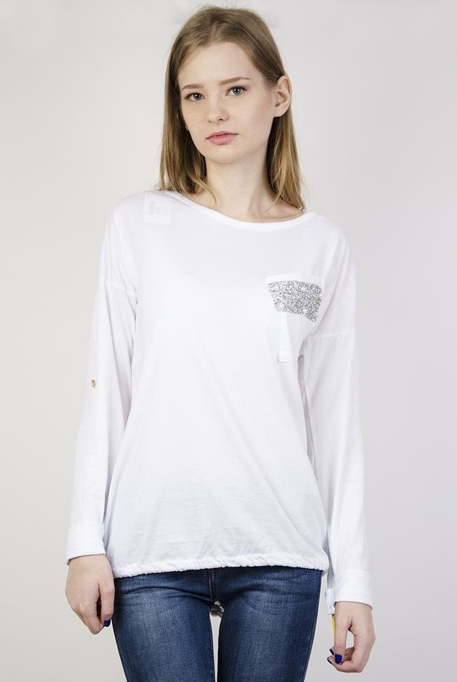 Biała bluzka z podwijanym rękawem oraz kieszonką zdobioną cekinami i koralikami, posiada guzik do podpięcia rękawa, ściągacz na dole