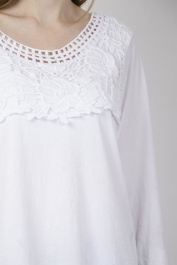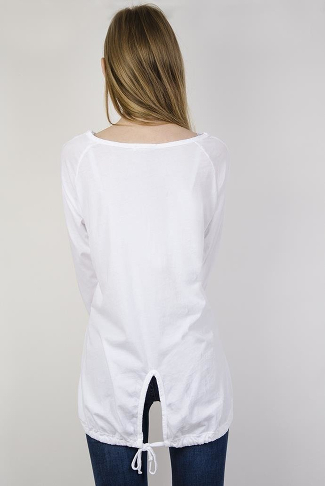 Biała bluzka z ażurowymi zdobieniami przy dekolcie oraz ze ściągaczem na dole