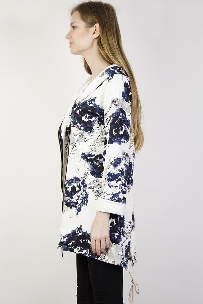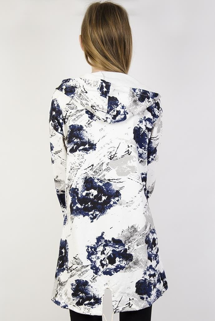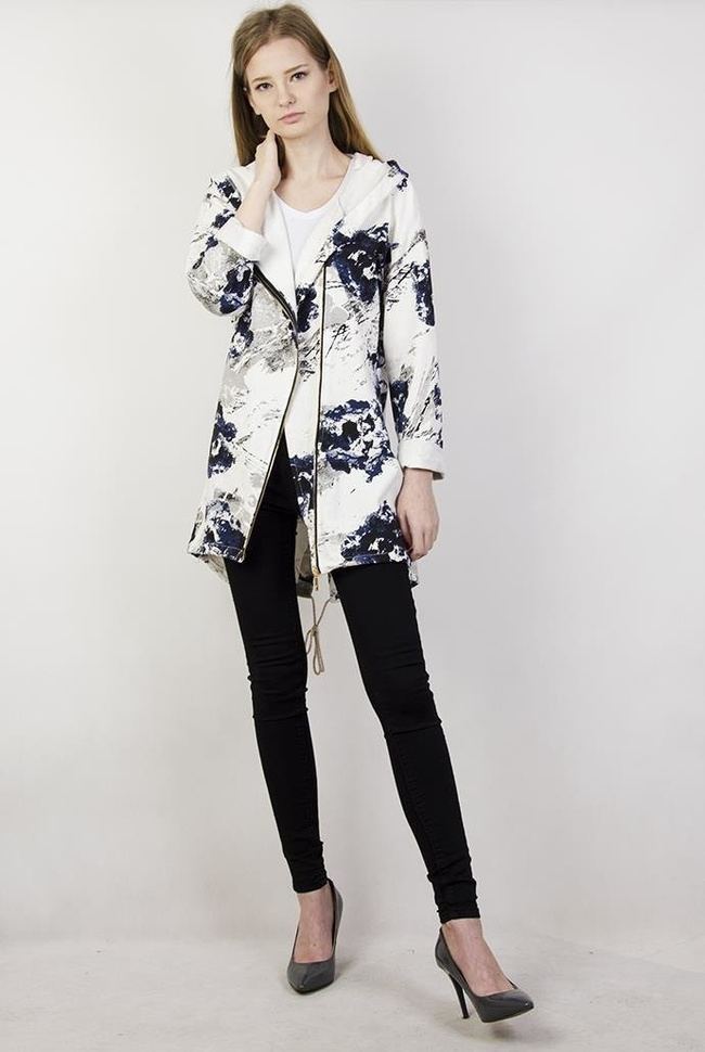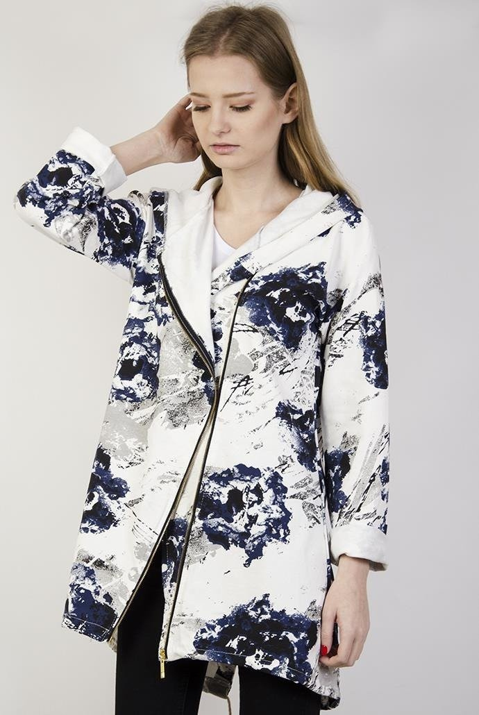 Biała narzuta w niebiesko-czarne wzory, zapinana na zamek, z kapturem i ściągaczem