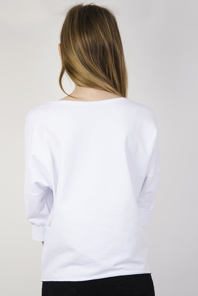Biała bluzka ze srebrnym misiem, koralikami i rękawem 7/8