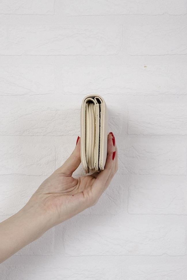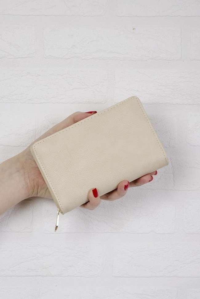 Beżowy portfel z licznymi przegródkami na banknoty oraz częścią zapinaną na zamek do przechowania monet WYMIARY: Szerokość: 15 cm Wysokość: 10 cm