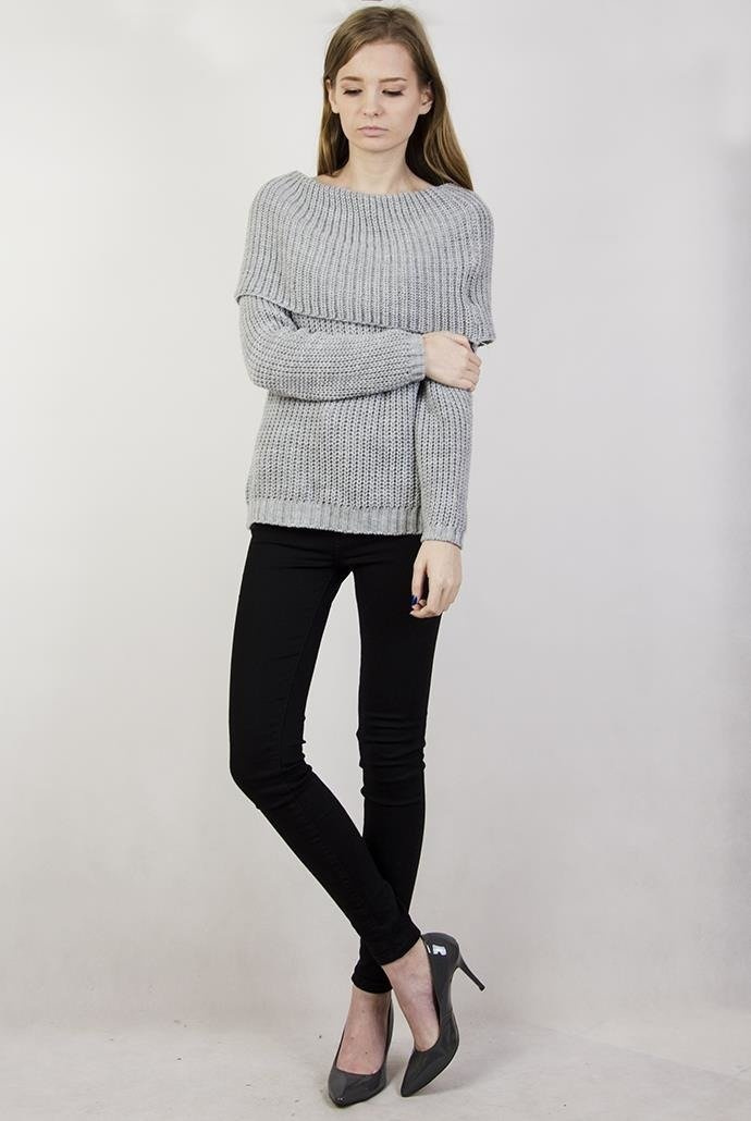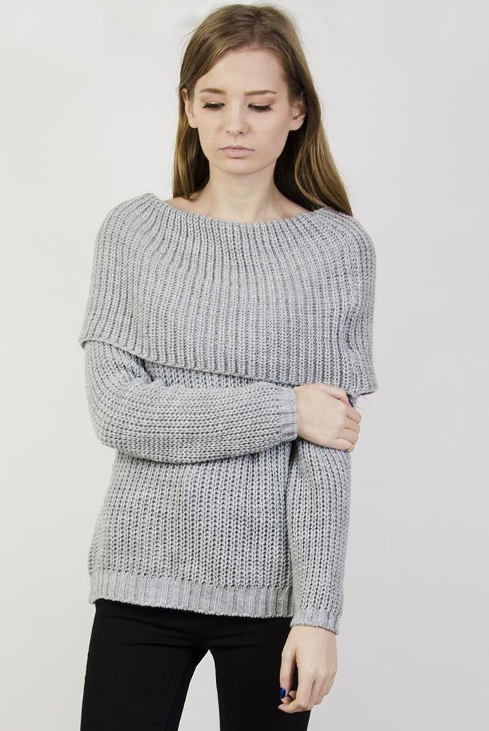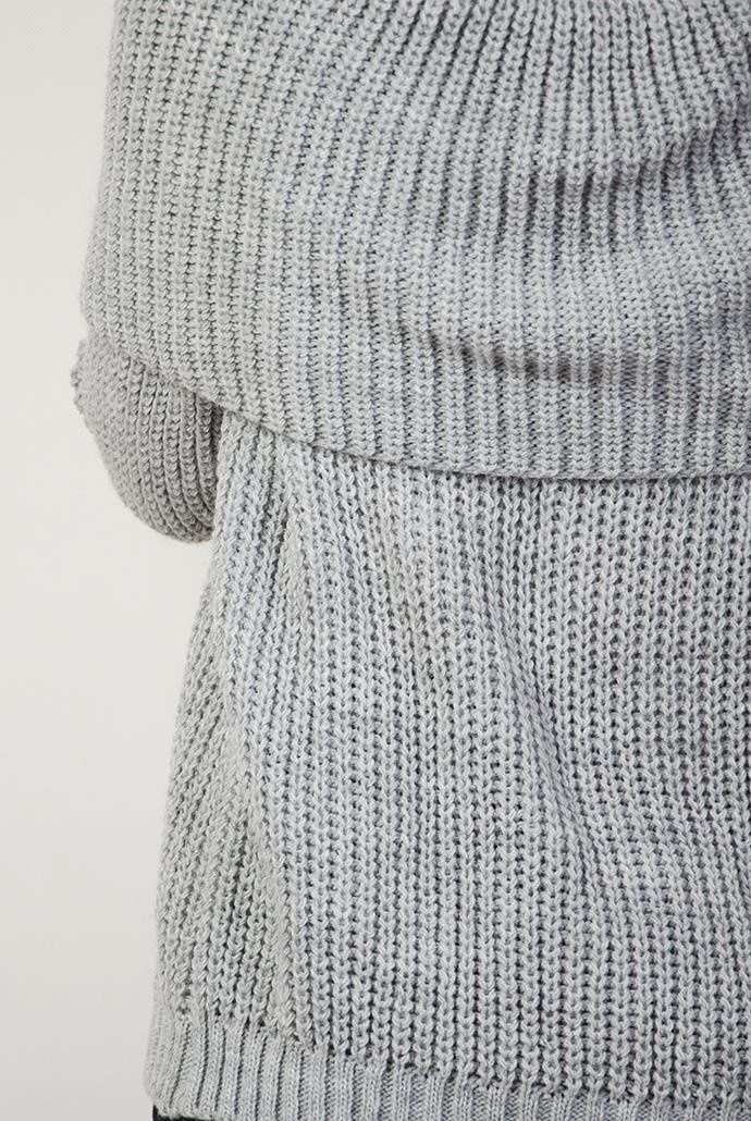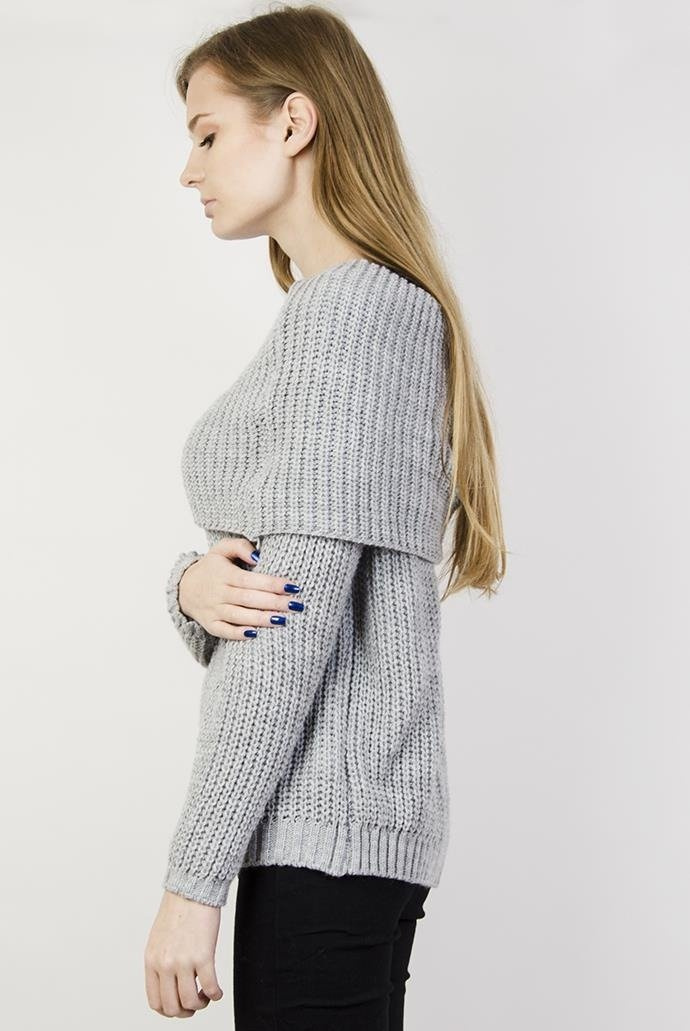 Szary sweter z golfem ściąganym na ramiona, z naszywką