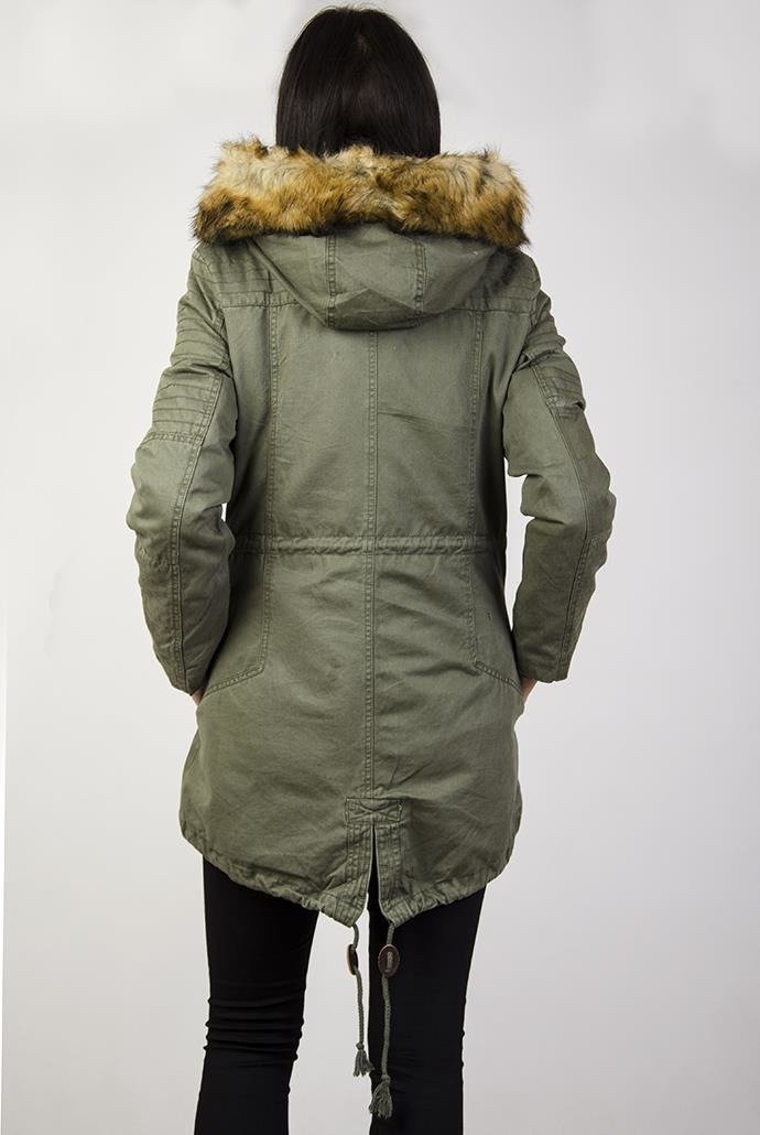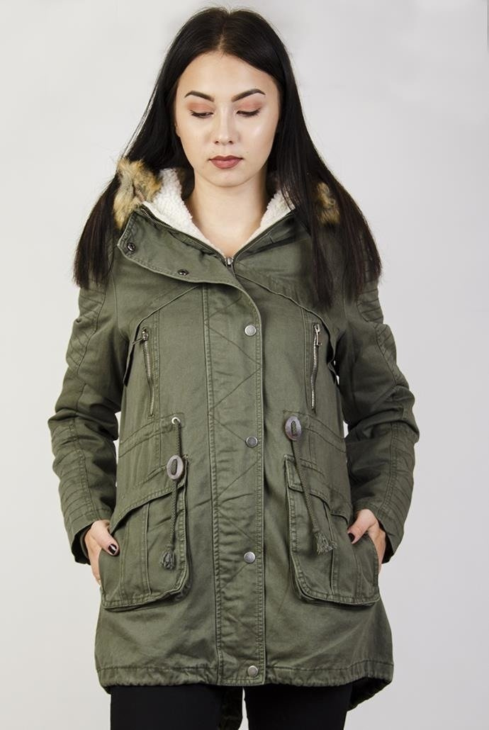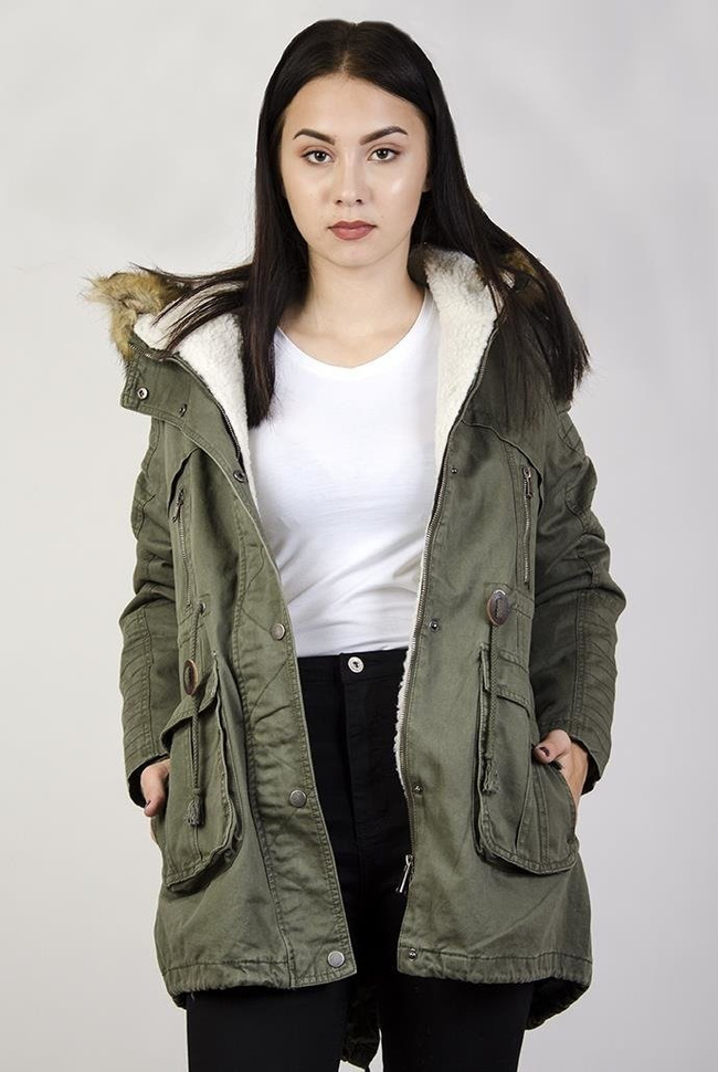 Khaki asymetryczna kurtka parka ocieplana (ocieplenie wewnątrz kurtki w postaci futerka można odpiąć), z kapturem, zapinana na zatrzaski oraz zamek. Posiada ściągacz w talii oraz na dole.