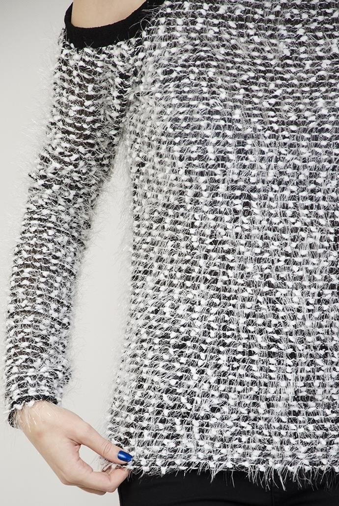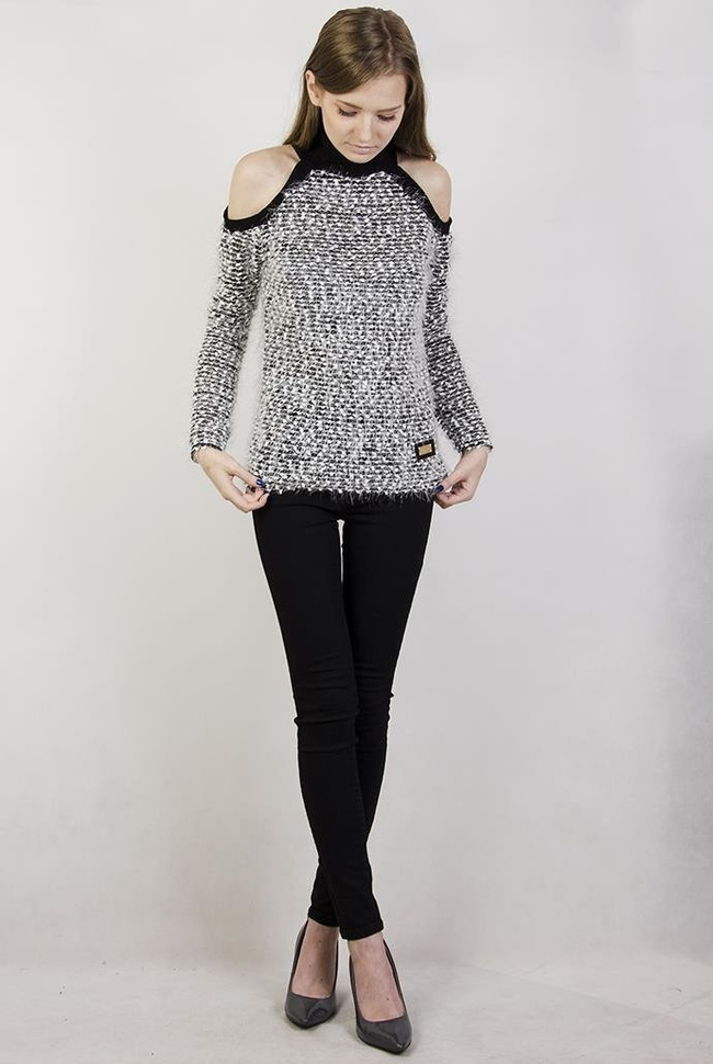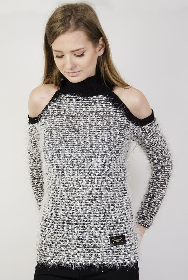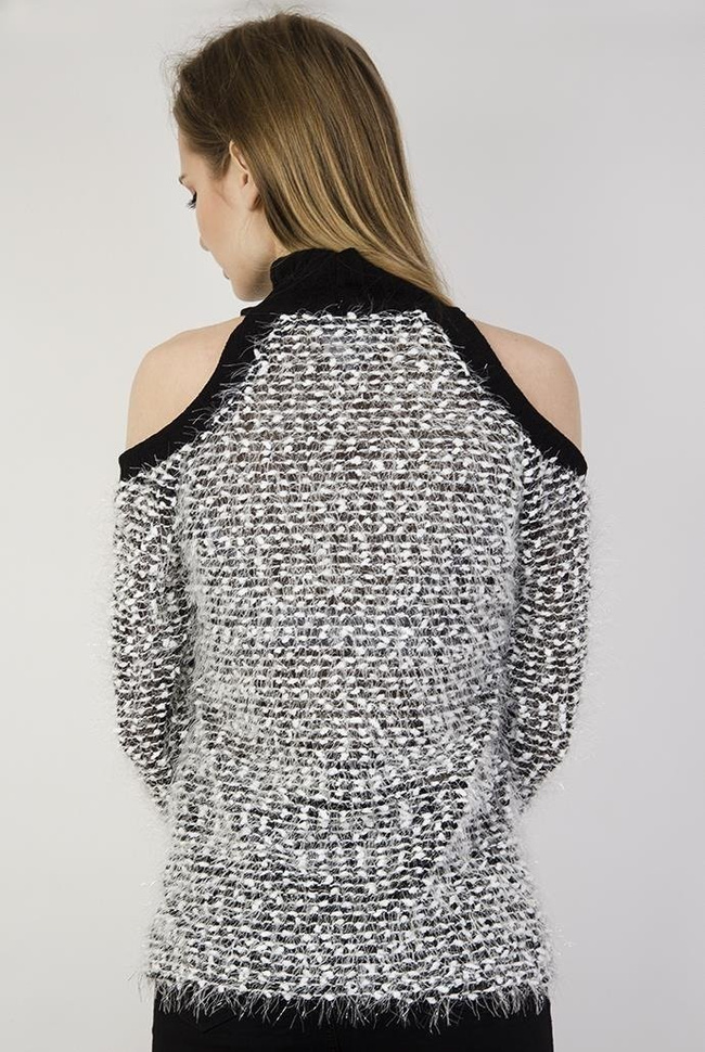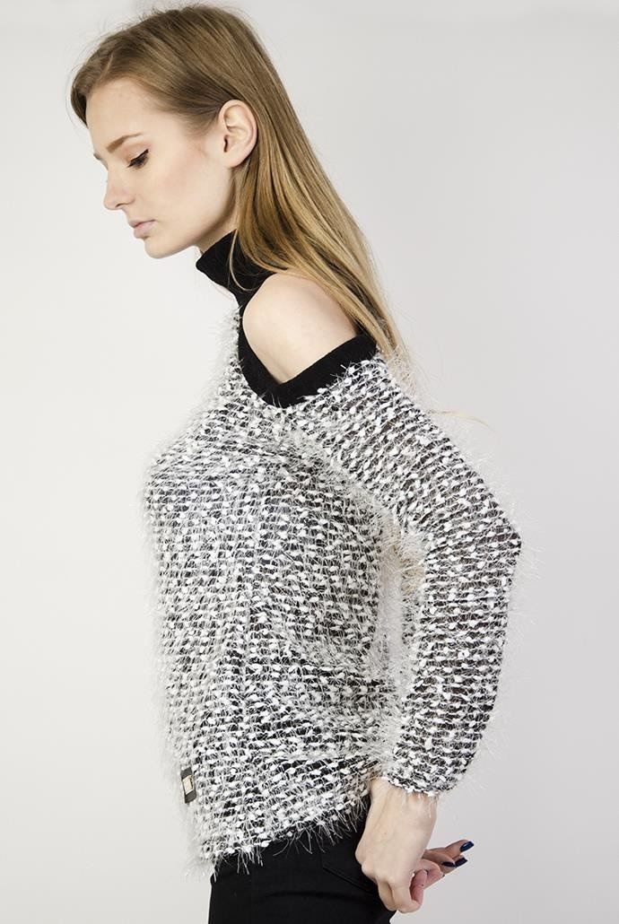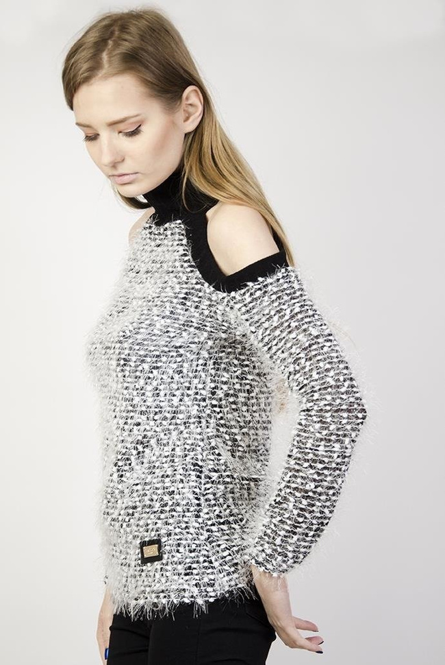 Włochaty sweterek z golfem i rozcięciami na ramionach