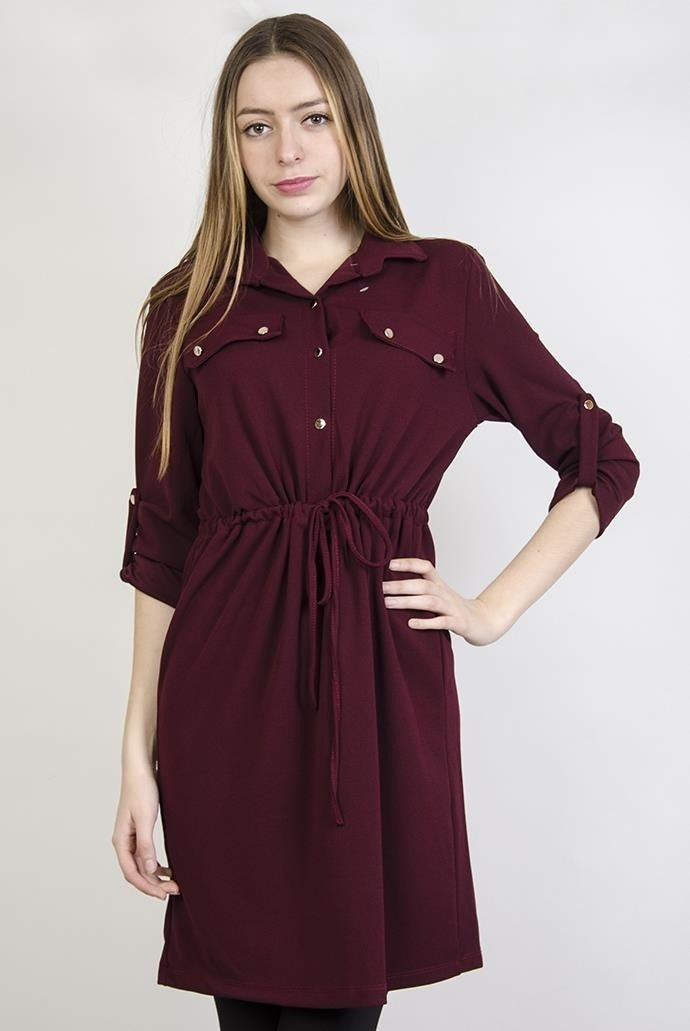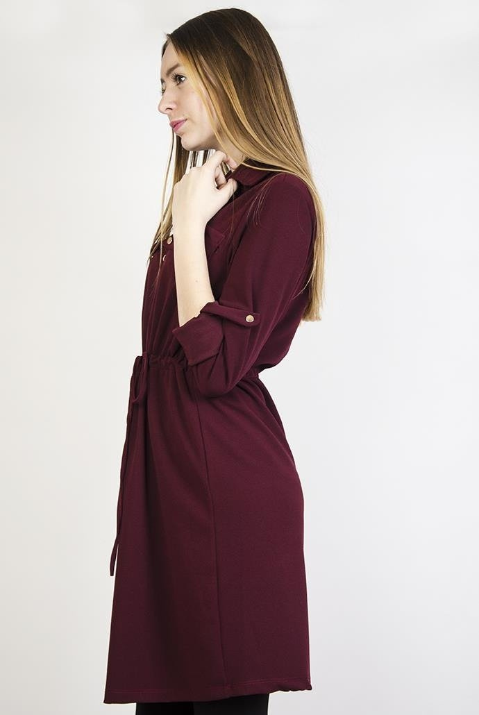 Bordowa sukienka ze ściągaczem w talii, posiada złote guziczki i długi rękaw.