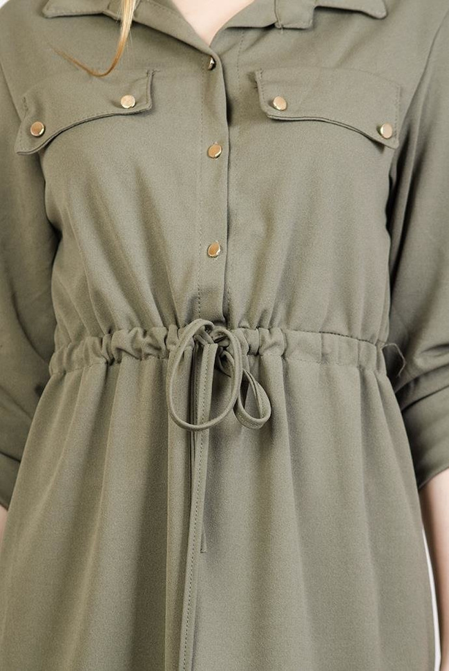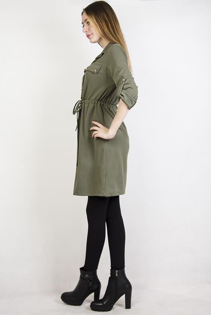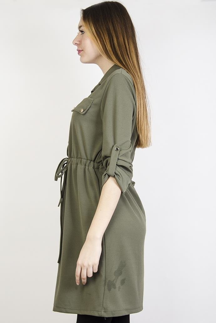 Zielona sukienka ze ściągaczem w talii, posiada złote guziczki i długi rękaw.