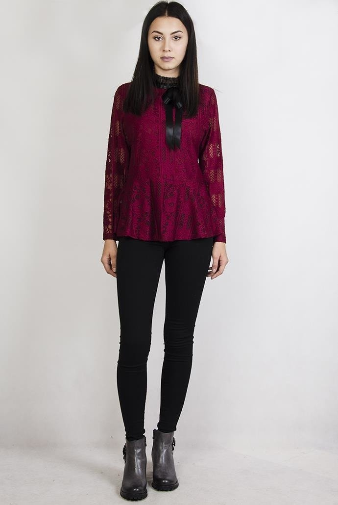 Bordowa, koronkowa bluzka z baskinką i czarnymi wstawkami. Posiada kokardę przy szyi.