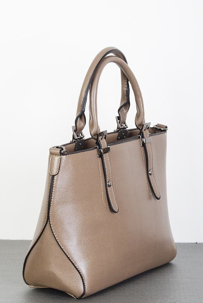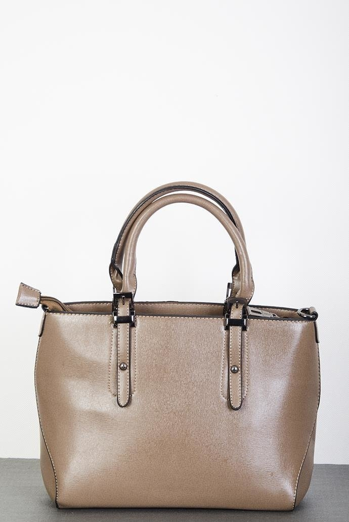 Usztywniana brązowa torebka średniej wielkości "shopper", przy rączkach posiada sprzączki. W środku dwie części oddzielone jedną przedziałką zapinaną na zamek, posiada także liczne przegródki np. na klucze czy portfel.