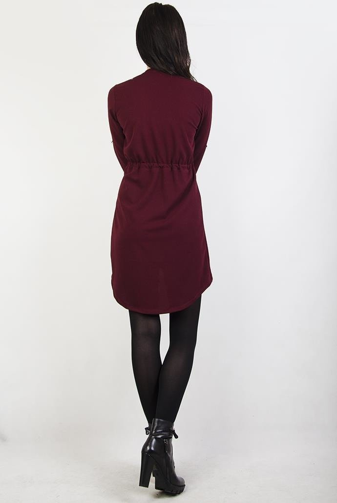 Asymetryczna sukienka bordowa z wiązaniem przy szyi oraz w talii, posiada dwie kieszonki.