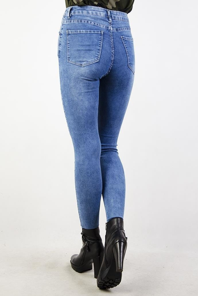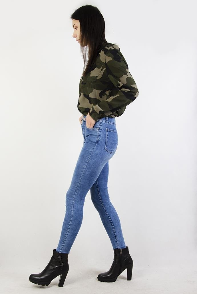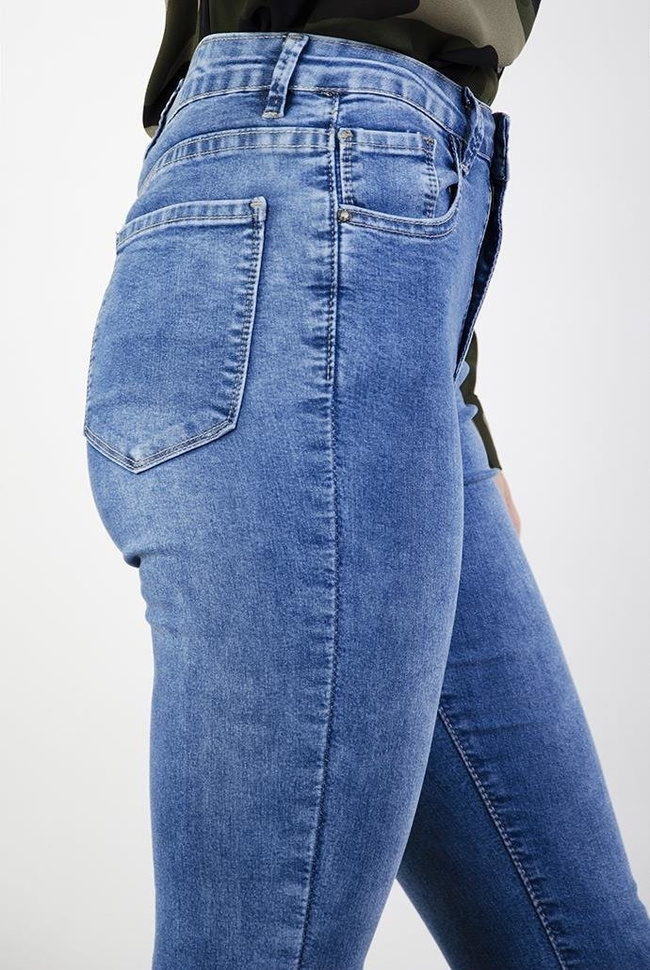 Jasne spodnie jeansowe przylegające, posiadają średni stan.