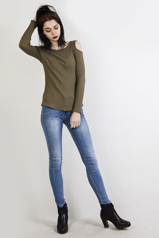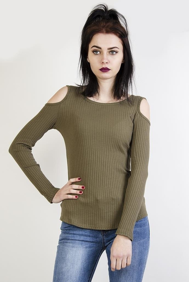 Zielona prążkowana bluzka z wycięciami na ramionach