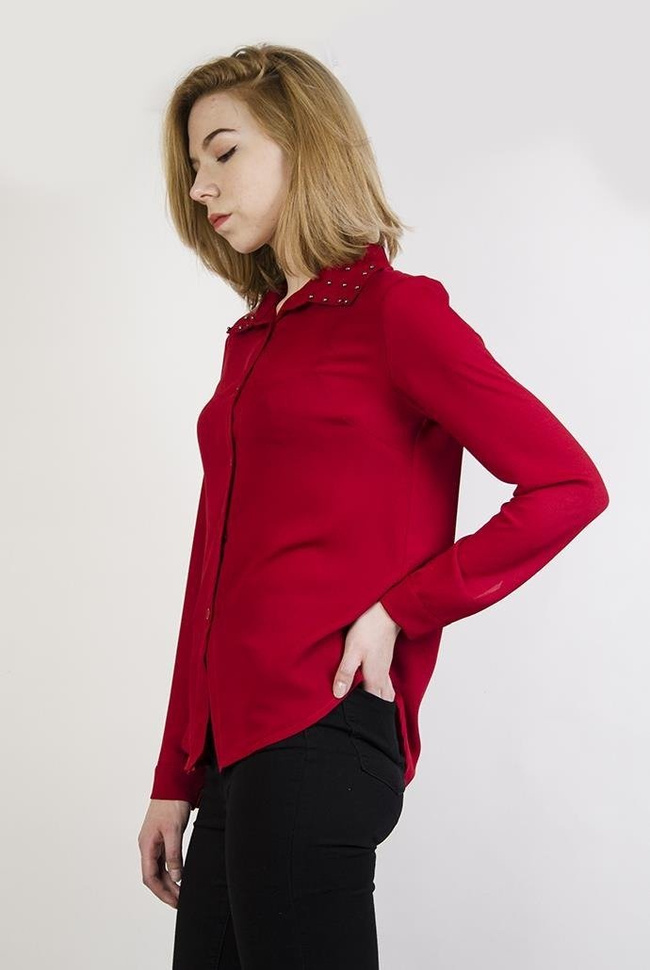 Czerwona koszula z ćwiekami przy kołnierzu.