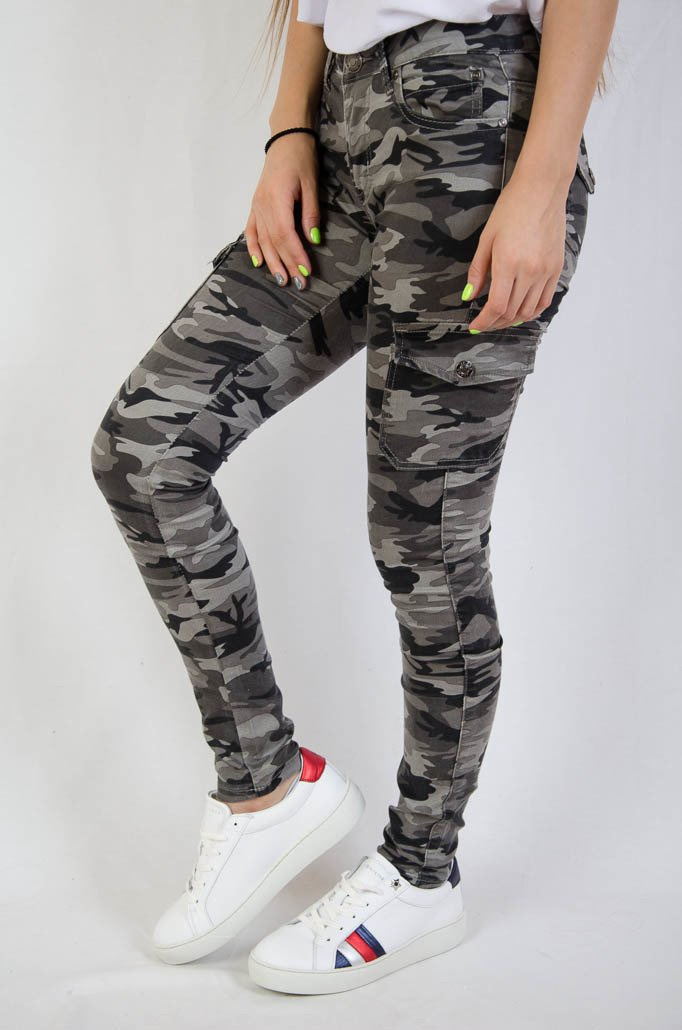 Spodnie moro z kieszeniami, idealnie przylegające.