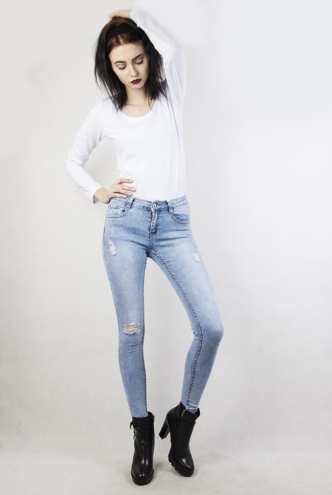 Jasne spodnie jeansowe, przylegające, z przetarciami.
