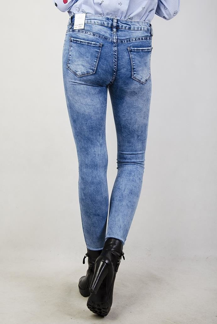 Spodnie jeansowe z ciemnymi łatami i przeszyciami