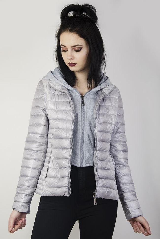 Kurtka pikowana szara, z szarym podszyciem, które można zapiąć na zamek. Posiada szary kaptur.