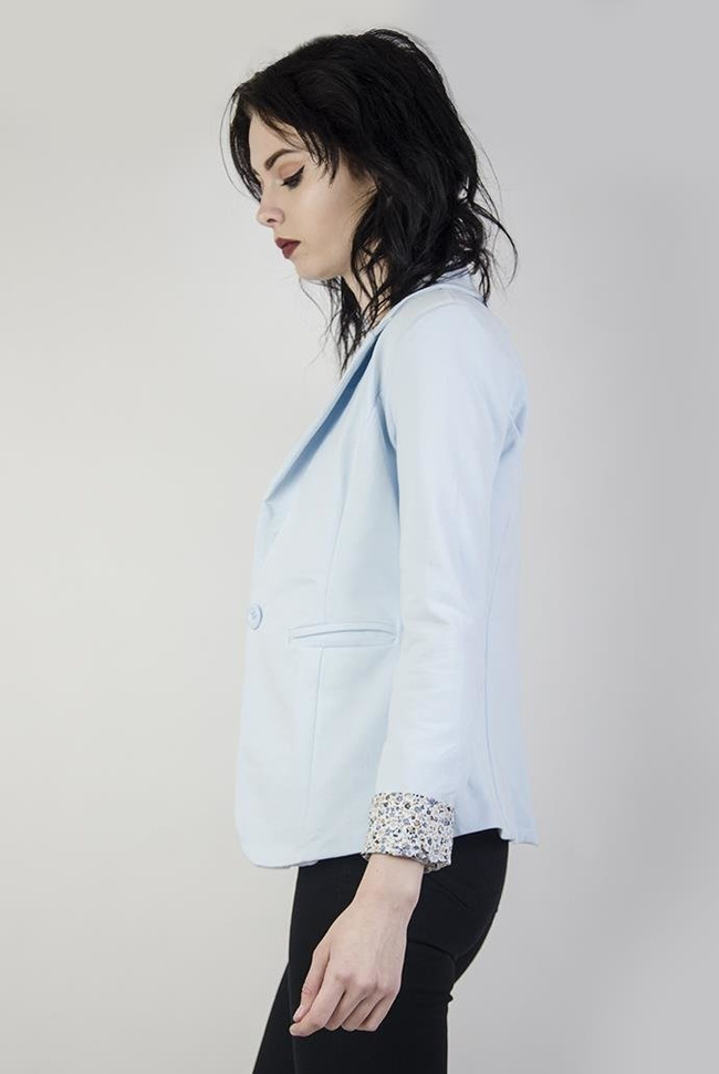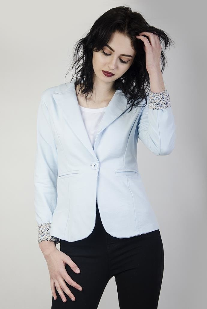 Jasnoniebieska marynarka z kwiatowymi wstawkami. Zapina na jeden guzik.