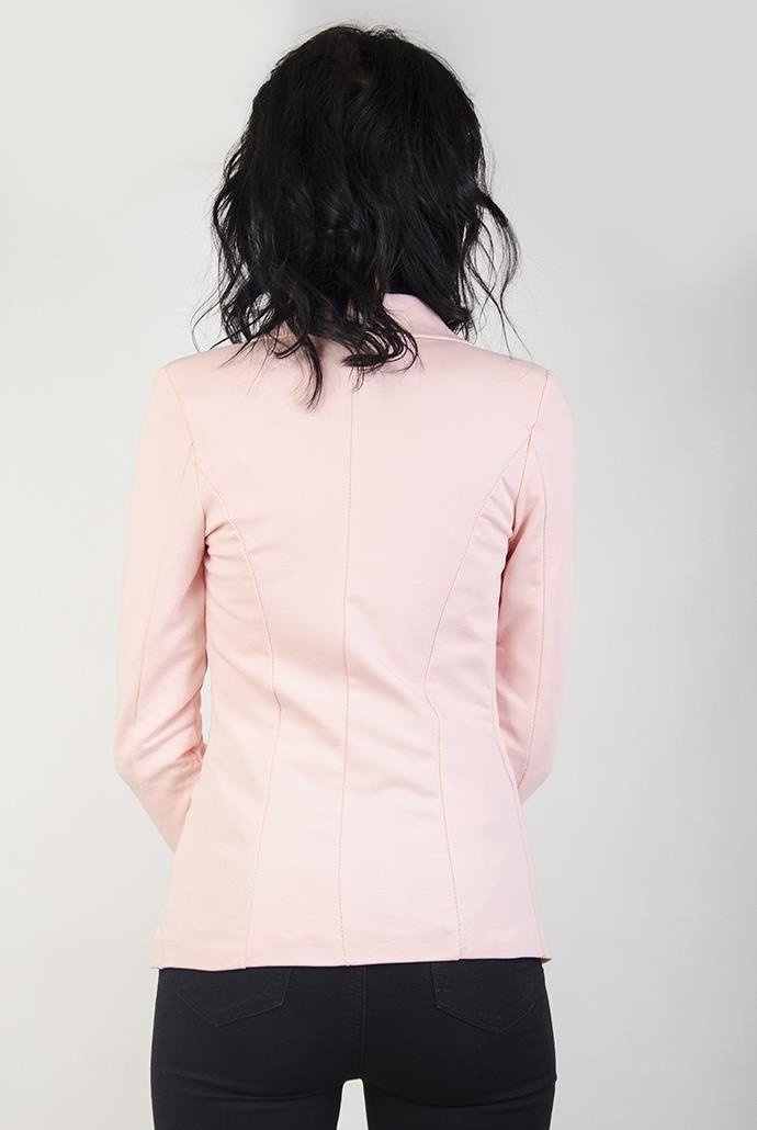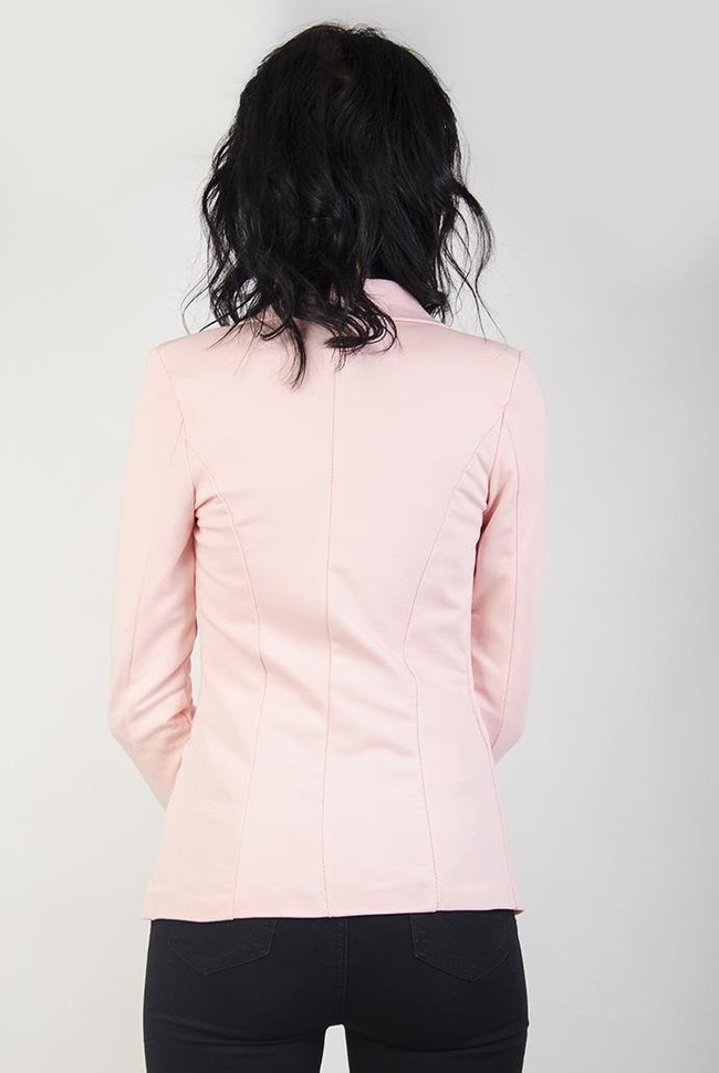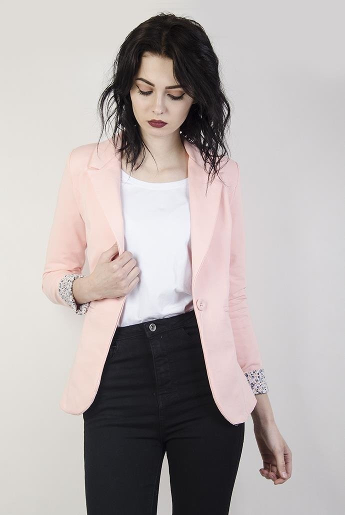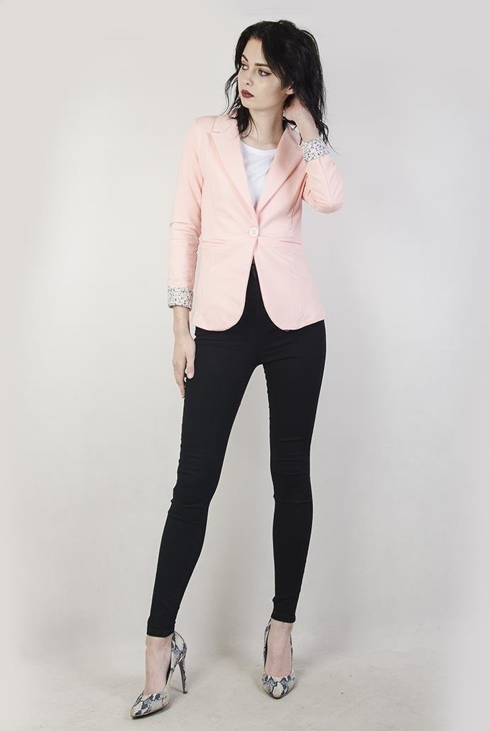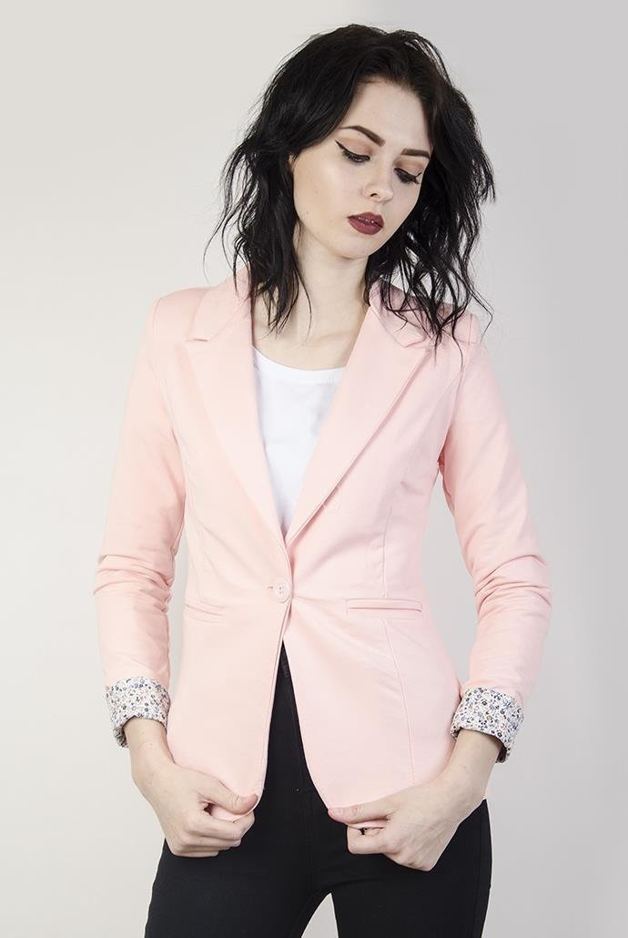 Jasnorożowa marynarka z kwiatowymi wstawkami. Zapina na jeden guzik.