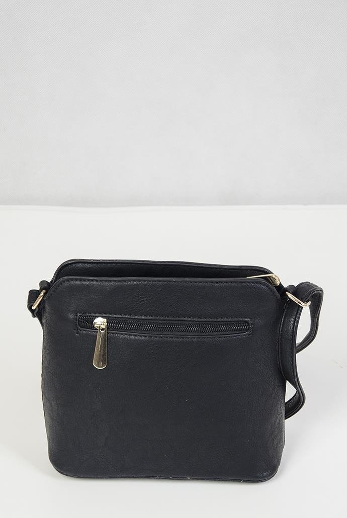 Mała, czarna torebka z ćwiekami po bokach. Posiada regulowany pasek. W środku przegródki na klucze czy portfel.
