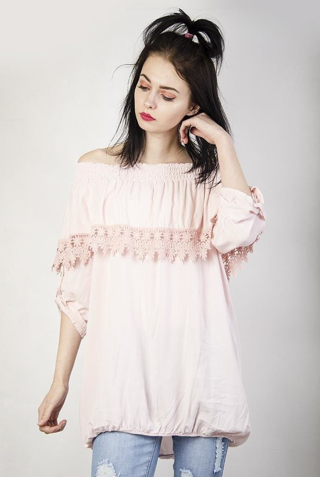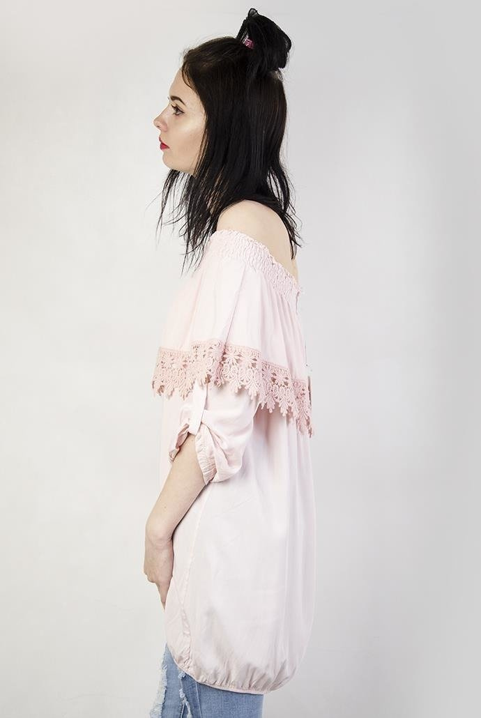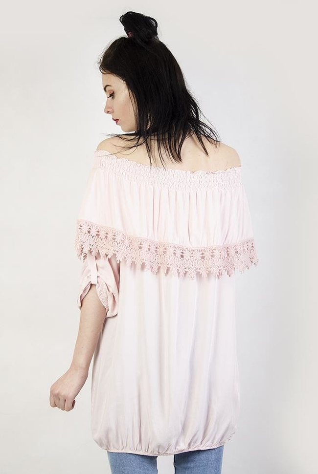 Jasnoróżowa przedłużana bluzka z falbaną przy dekolcie