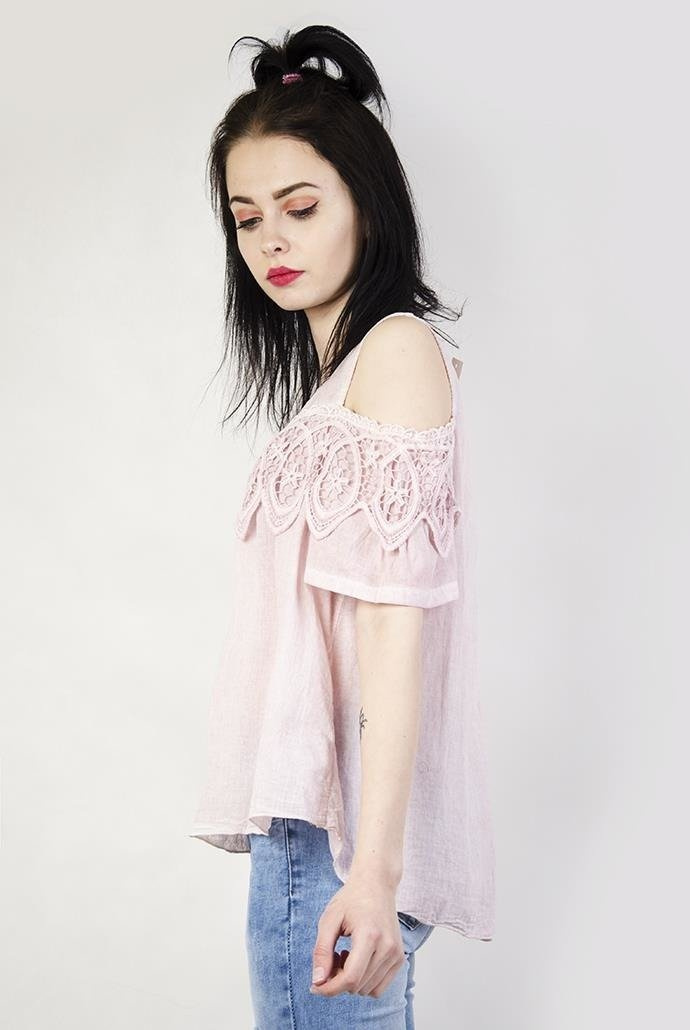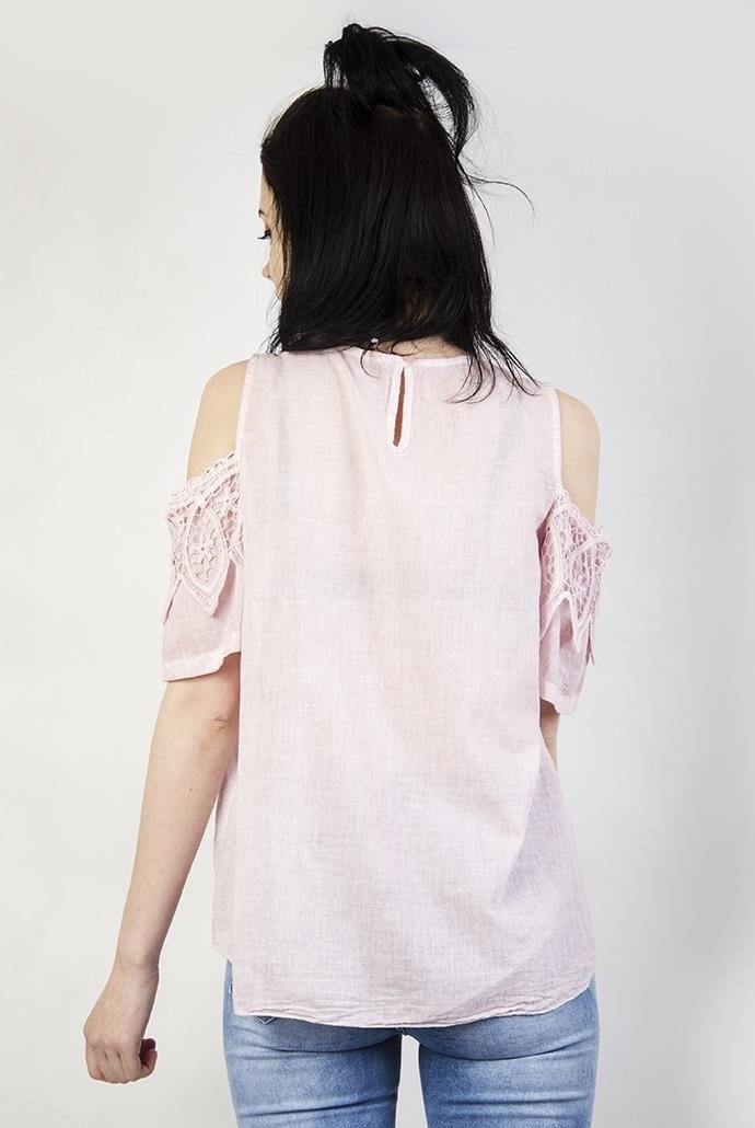 Jasnoróżowa bluzka z wyciętymi ramionami i ażurowym zdobieniem