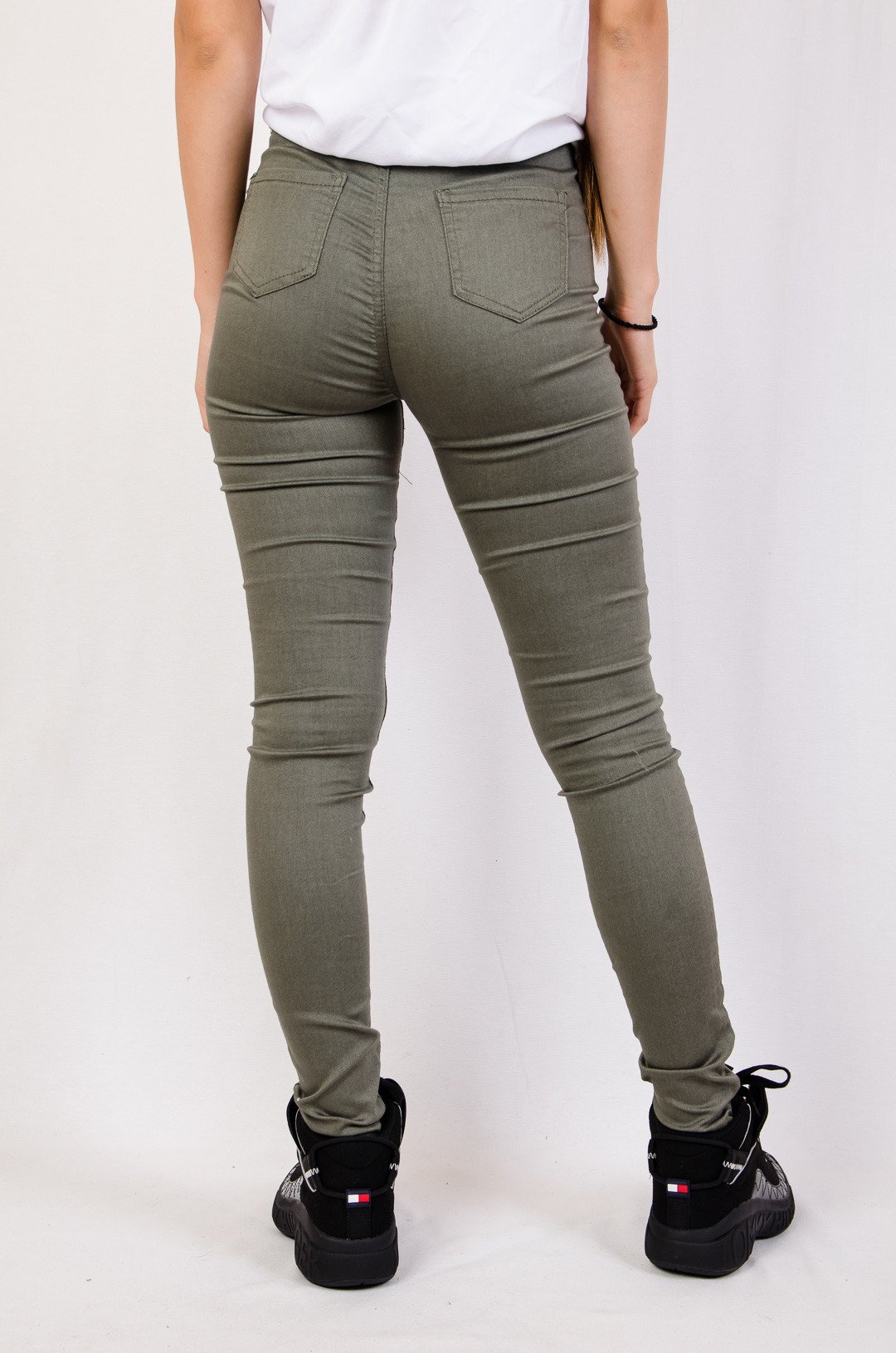 Zielone spodnie skinny jeans z wysokim stanem. Spodnie nie posiadają kieszeni z przodu. Nogawkę można odwinąć.
