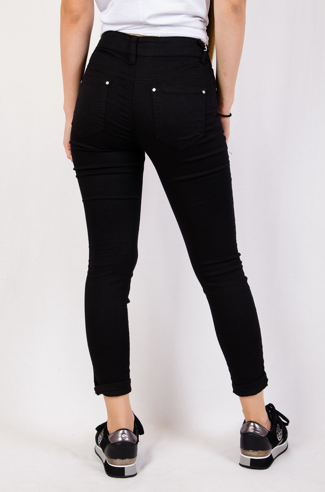 Czarne spodnie jeansowe z naszywkami i dziurami. Posiadają wysoki stan.