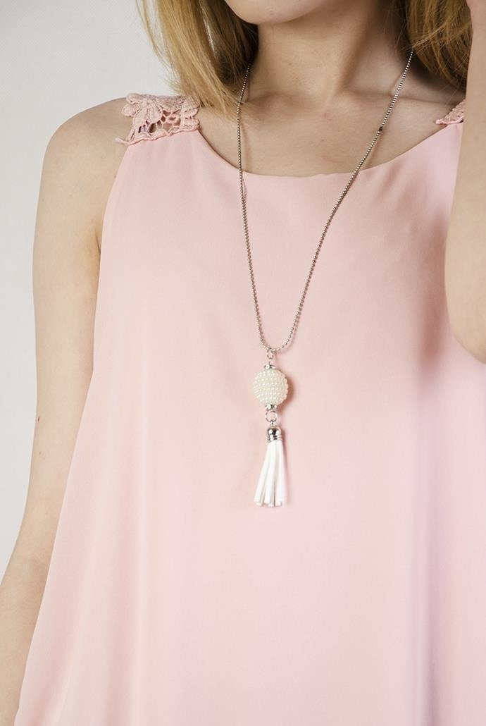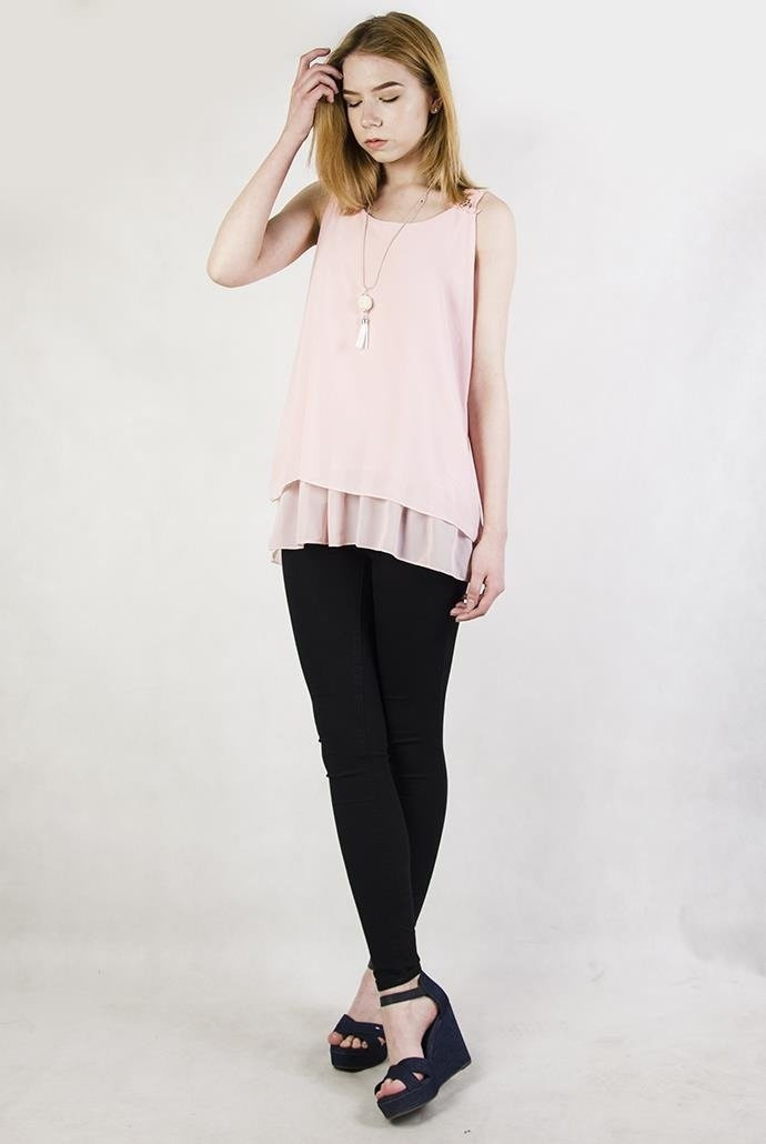 Jasnoróżowa bluzka z ażurowym zdobieniem z tyłu. Bez wisiorka