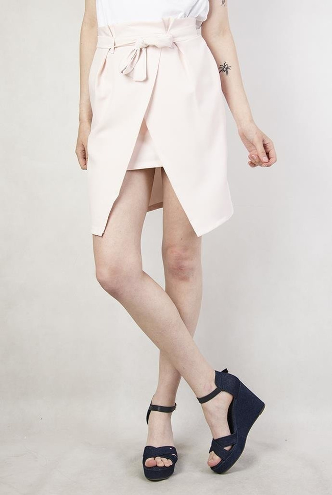 Jasnoróżowa spódniczka z wycięciem i kokardą z przodu.