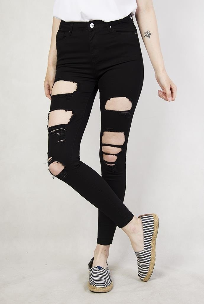Czarne spodnie jeansowe z dziurami i wysokim stanem