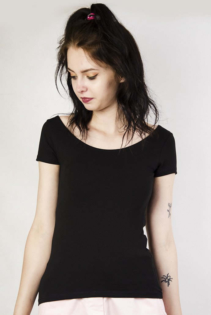 Czarna bluzka z dekoltem w łódkę oraz wycięciem na plecach