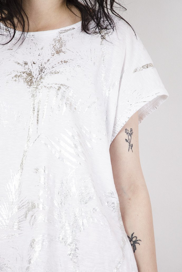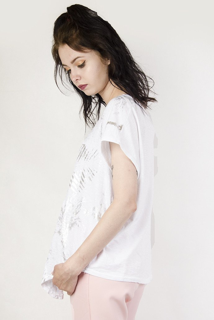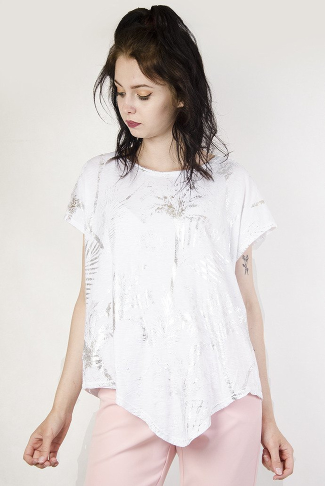 Biała bluzka w srebrne palmy. Posiada przedłużony przód.