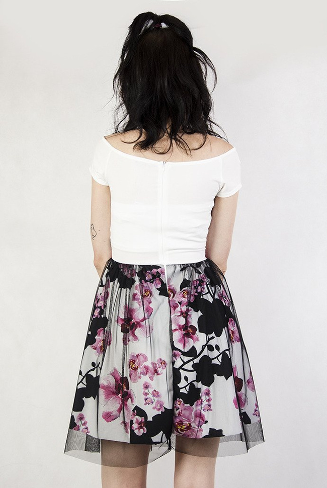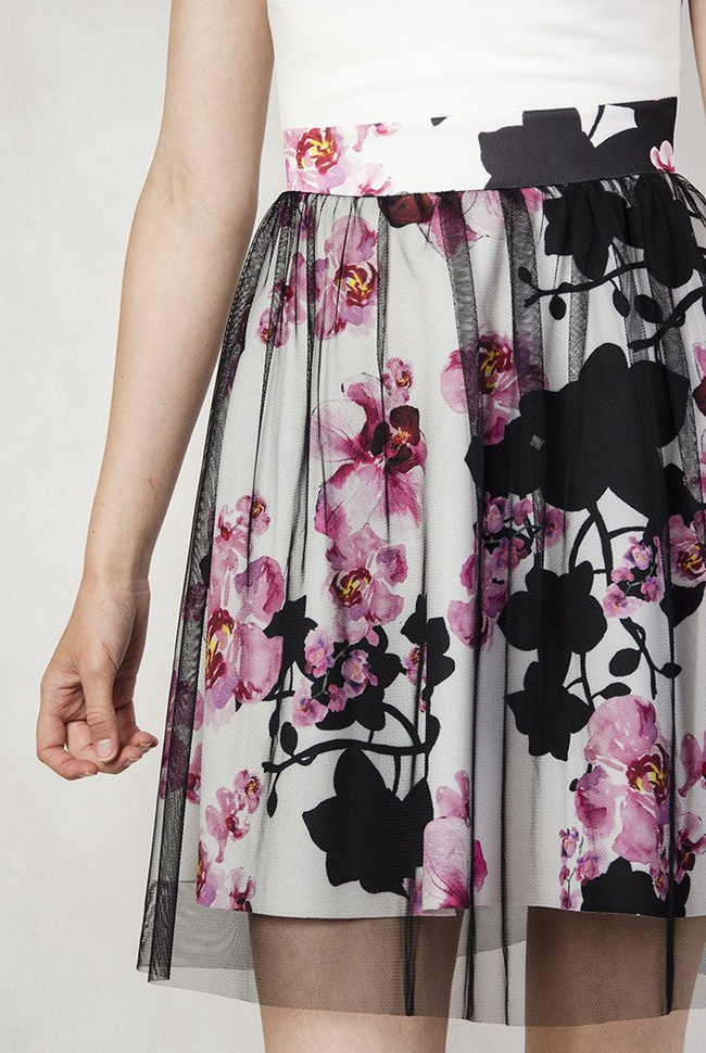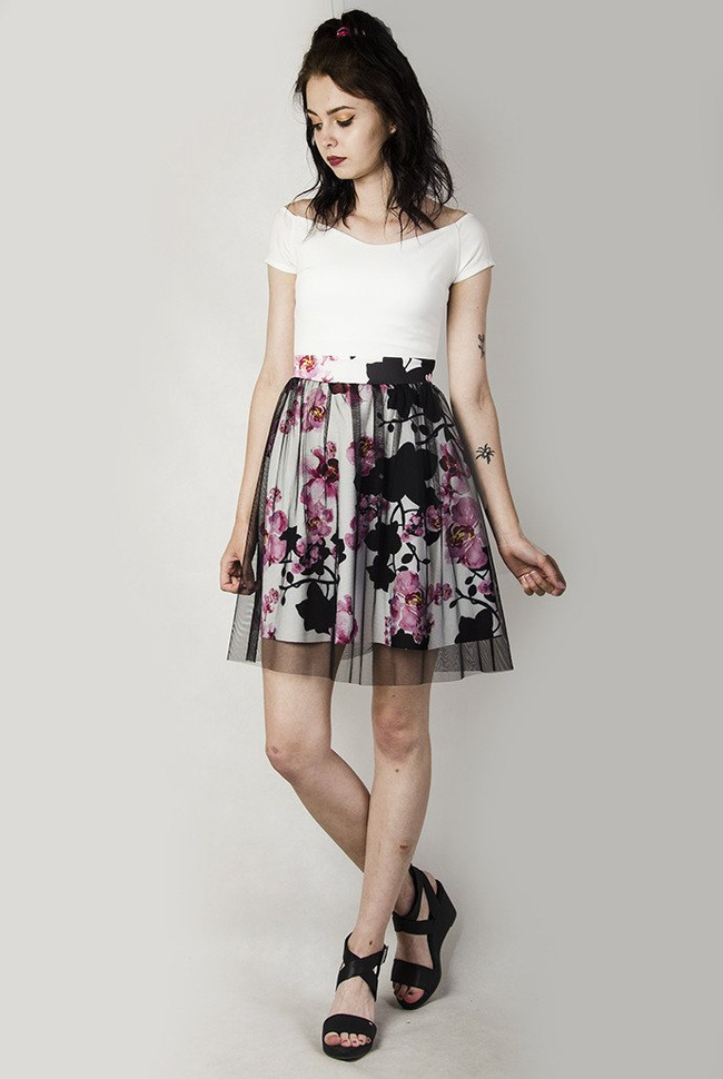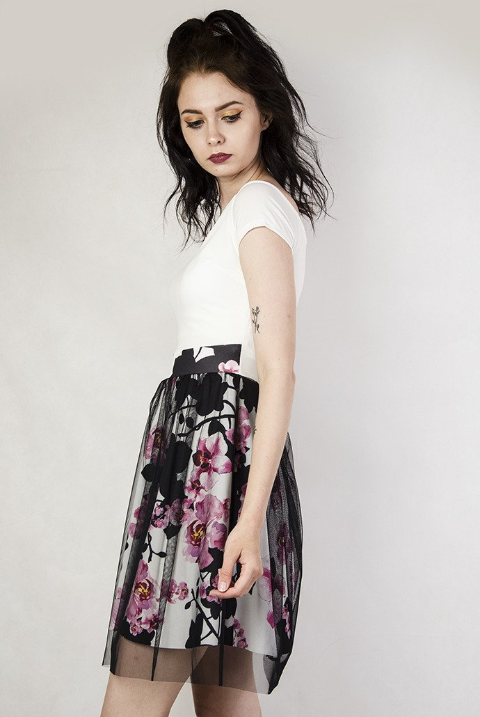 Biała sukienka z dołem w kwiaty, z siateczkowym obszyciem. Posiada szeroki dekolt.