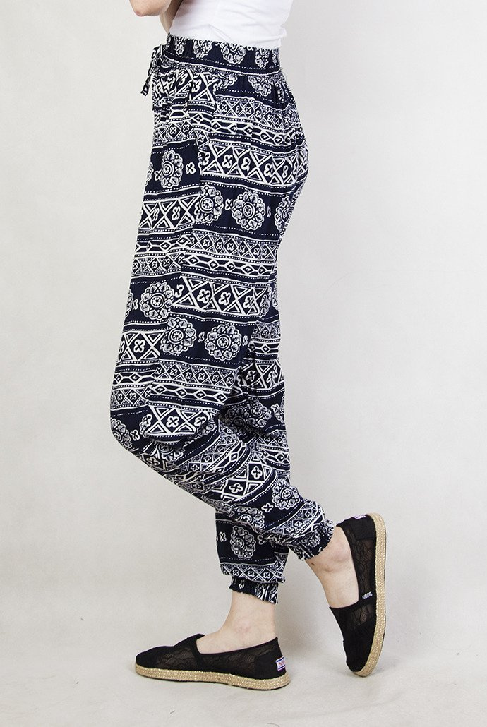Granatowe spodnie alladynki w kwiaty i trójkąty