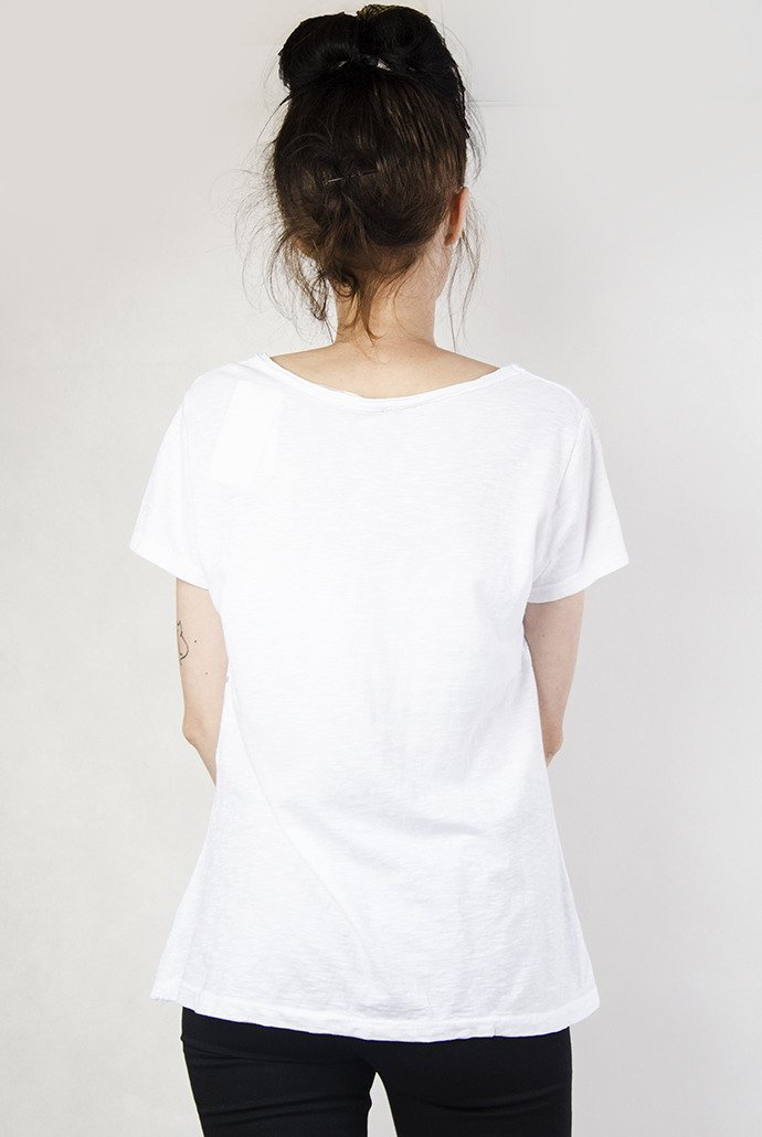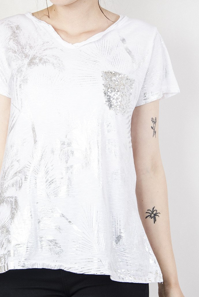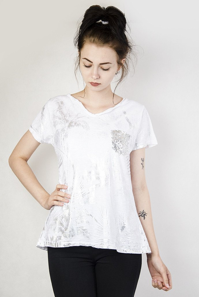 Biała bluzka w srebrne palmy, z cekinową kieszonką.