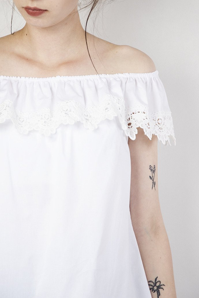Biała bluzka koszulowa z hiszpańskim dekoltem. Posiada gumkę przy dekolcie.