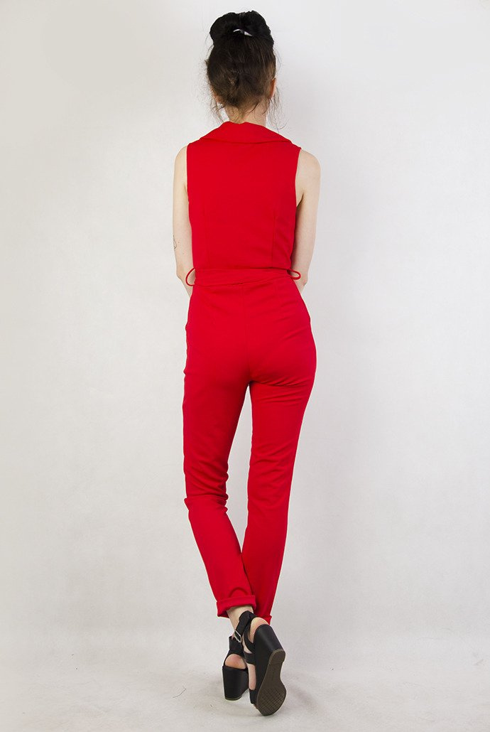 Czerwony kombinezon z zakładkami. Posiada wiązanie w pasie.