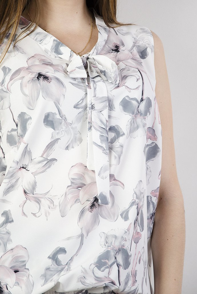 Biała bluzka w szaro-różowe kwiaty.