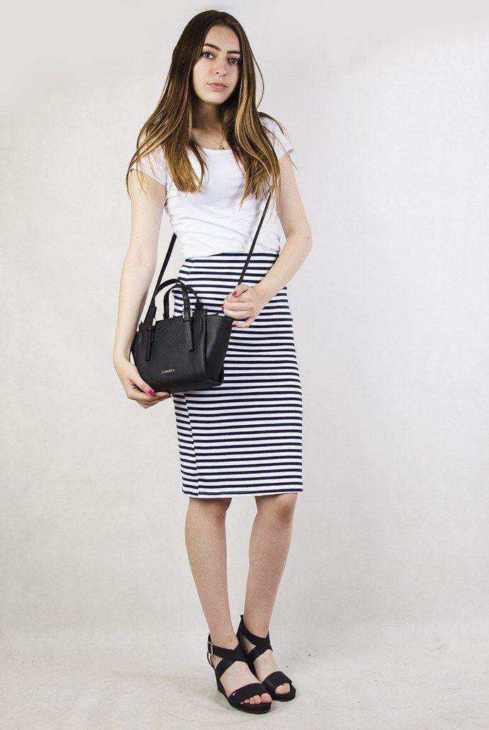 Biało-granatowa dopasowana spódnica w cienkie paski