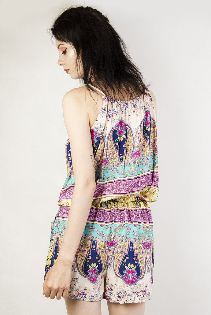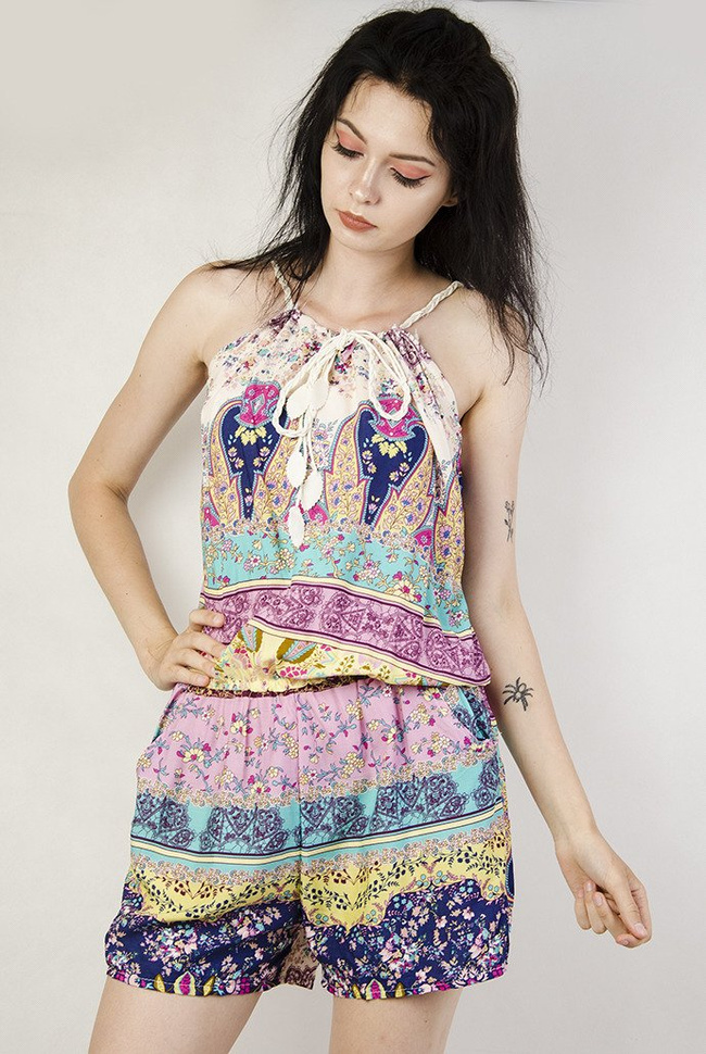 Wielokolorowy zwiewny kombinezon z wiązaniem wykończonym listkami.