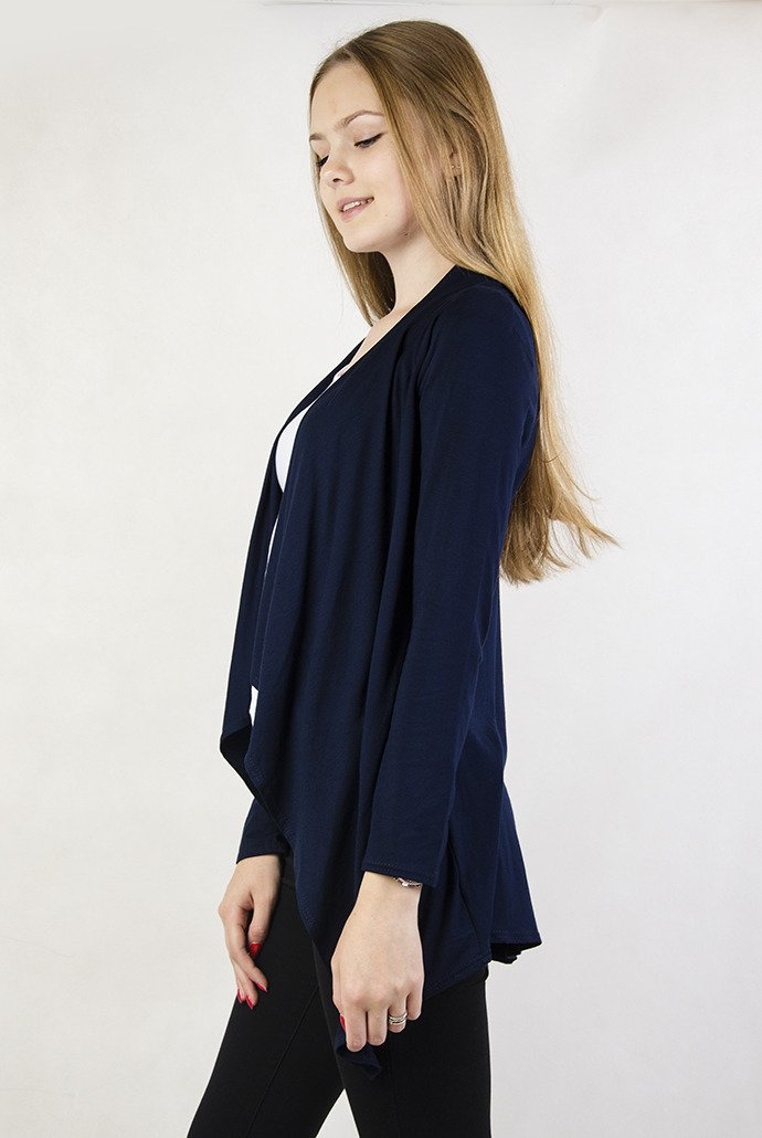 Granatowa narzutka. Nie posiada zapięcia.